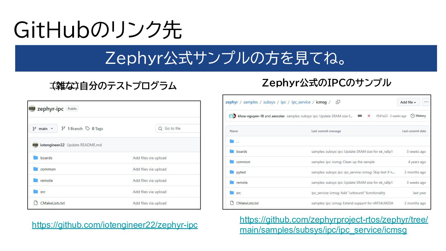 GitHubのリンク先 Zephyr公式サンプルの方を見てね。 https://github.com/zephyrproject-rtos/zephyr/tree/ main/samples/subsys/ipc/ipc_service/icmsg Zephyr公式のIPCのサンプル (雑な)自分のテストプログラム https://github.com/iotengineer22/zephyr-ipc