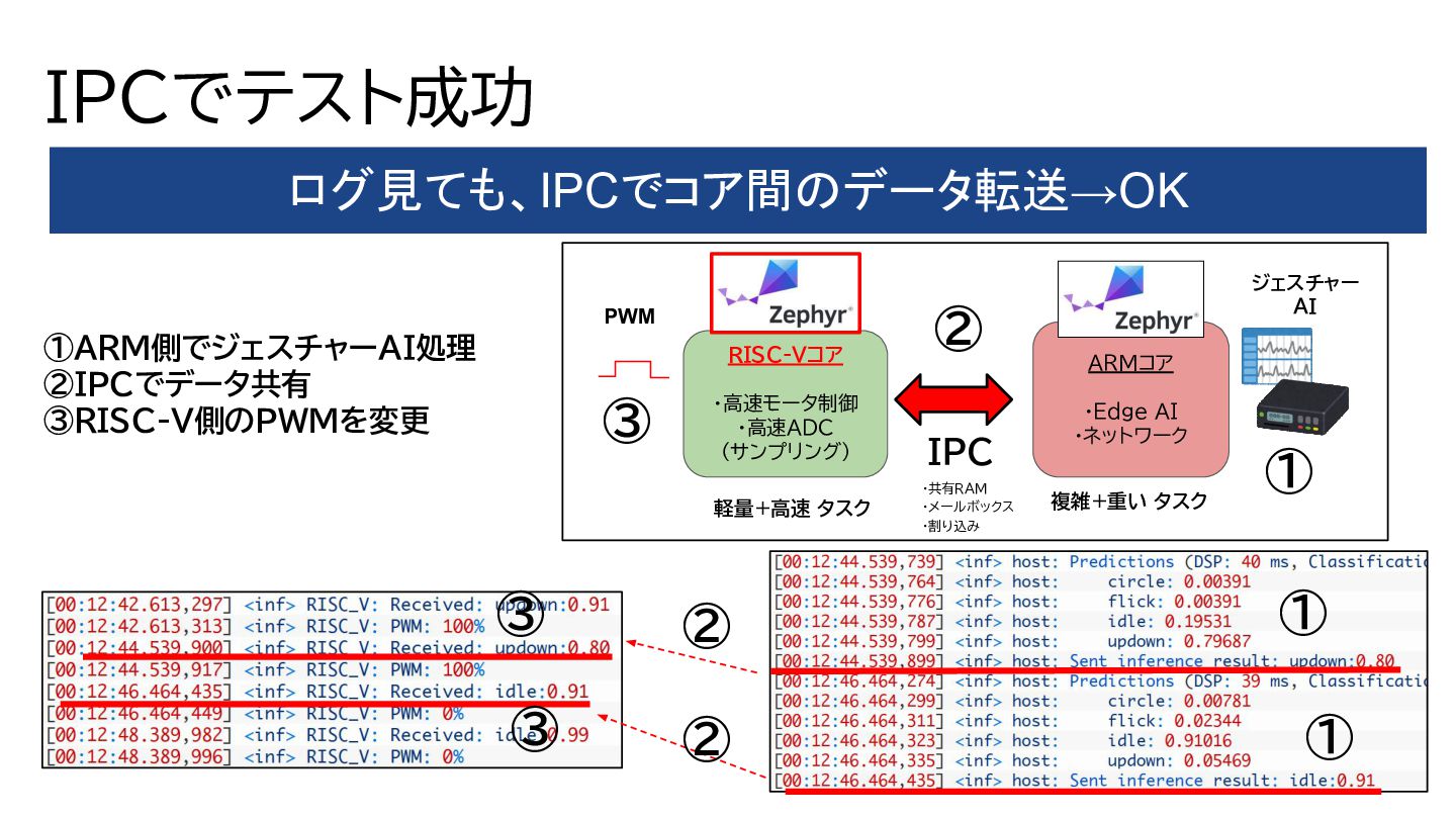 ・高速モータ制御 ・高速ADC (サンプリング) 軽量+高速 タスク PWM ジェスチャー AI ・共有RAM ・メールボックス ・割り込み ① ② ③ ①ARM側でジェスチャーAI処理 ②IPCでデータ共有 ③RISC-V側のPWMを変更 ① ② ③ ① ② ③