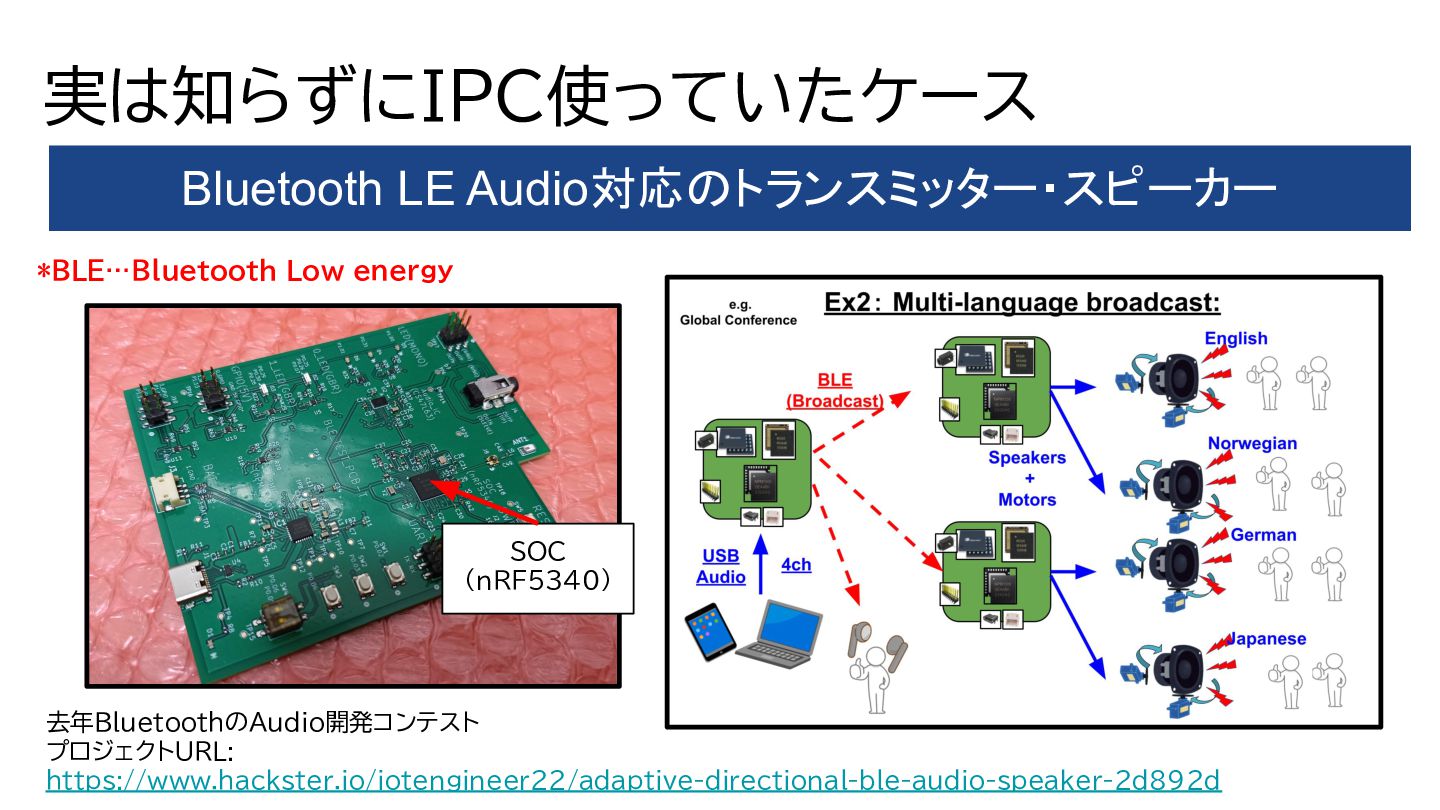 実は知らずにIPC使っていたケース Bluetooth LE Audio対応のトランスミッター・スピーカー 去年BluetoothのAudio開発コンテスト プロジェクトURL: https://www.hackster.io/iotengineer22/adaptive-directional-ble-audio-speaker-2d892d SOC (nRF5340) *BLE…Bluetooth