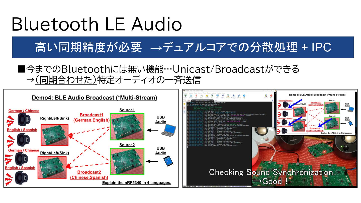 Bluetooth LE Audio ▪今までのBluetoothには無い機能…Unicast/Broadcastができる →(同期合わせた)特定オーディオの一斉送信 高い同期精度が必要 →デュアルコアでの分散処理 + IPC
