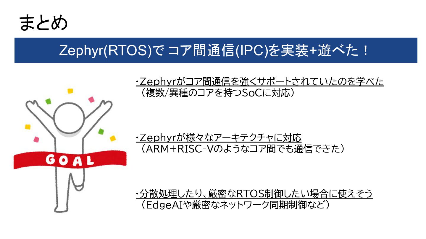 ・Zephyrがコア間通信を強くサポートされていたのを学べた (複数/異種のコアを持つSoCに対応) ・Zephyrが様々なアーキテクチャに対応 (ARM+RISC-Vのようなコア間でも通信できた) ・分散処理したり、厳密なRTOS制御したい場合に使えそう (EdgeAIや厳密なネットワーク同期制御など) まとめ Zephyr(RTOS)で コア間通信(IPC)を実装+遊べた!
