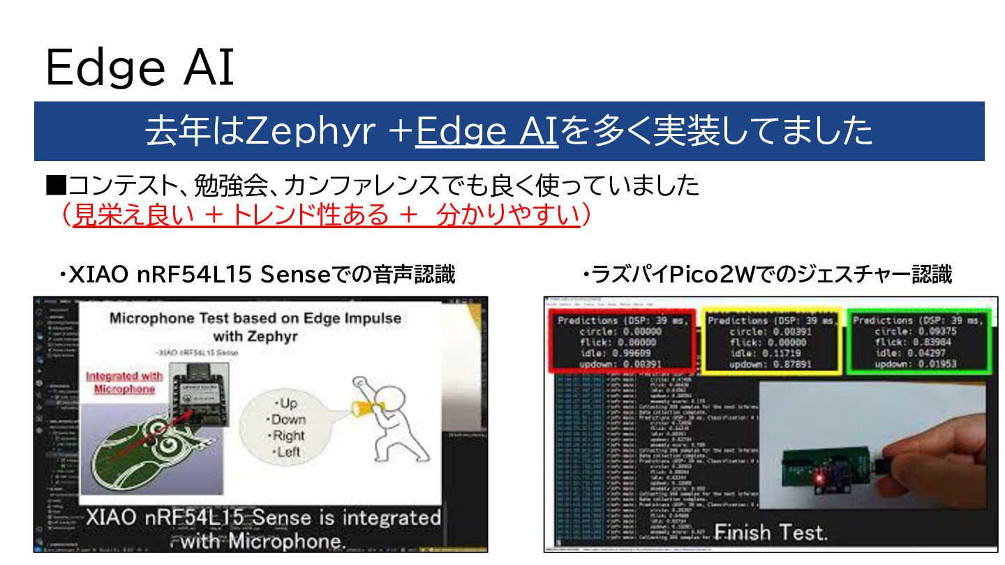 Edge AI 去年はZephyr +Edge AIを多く実装してました ▪コンテスト、勉強会、カンファレンスでも良く使っていました (見栄え良い + トレンド性ある + 分かりやすい)
