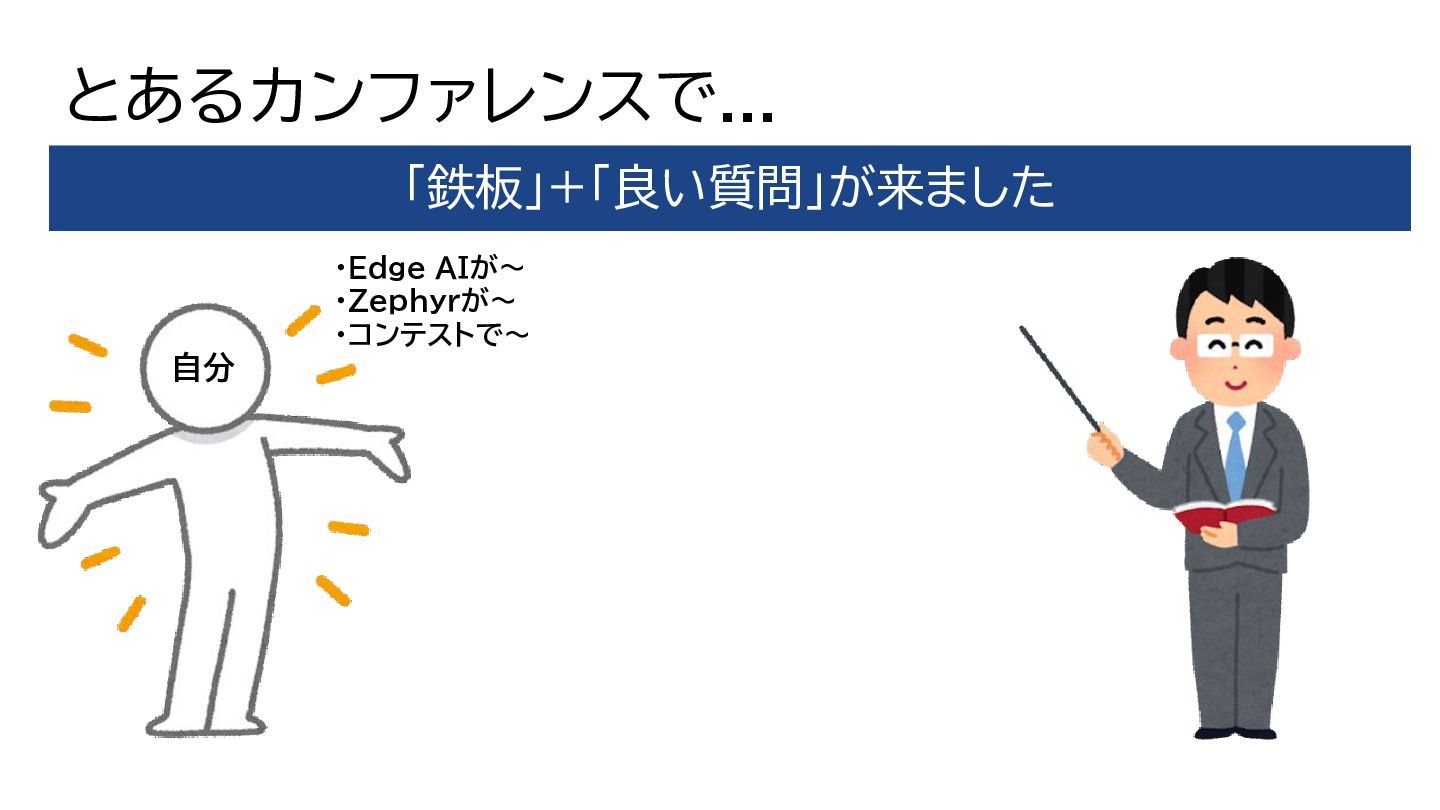 とあるカンファレンスで... 「鉄板」+「良い質問」が来ました ・Edge AIが~ ・Zephyrが~ ・コンテストで~ 自分