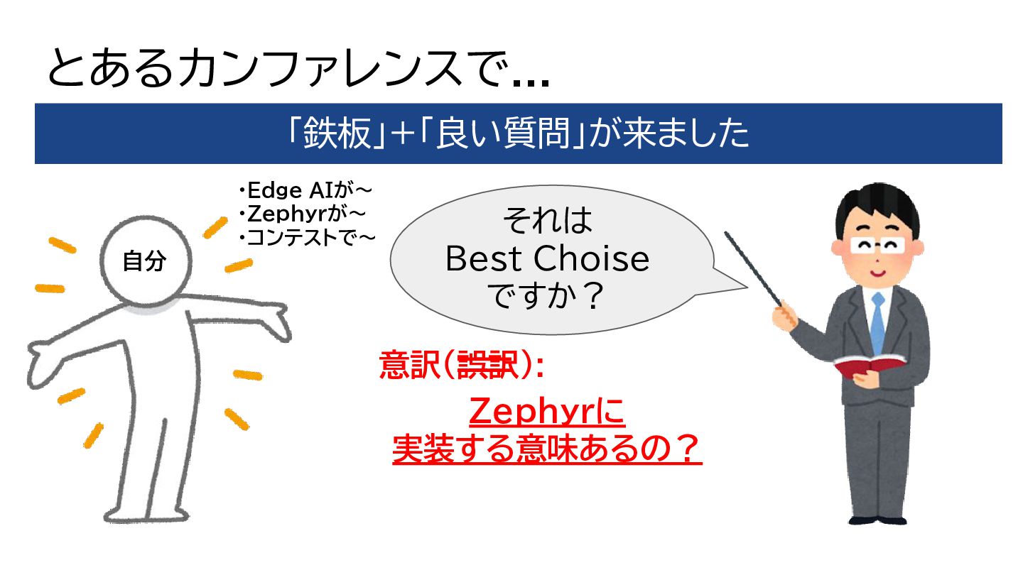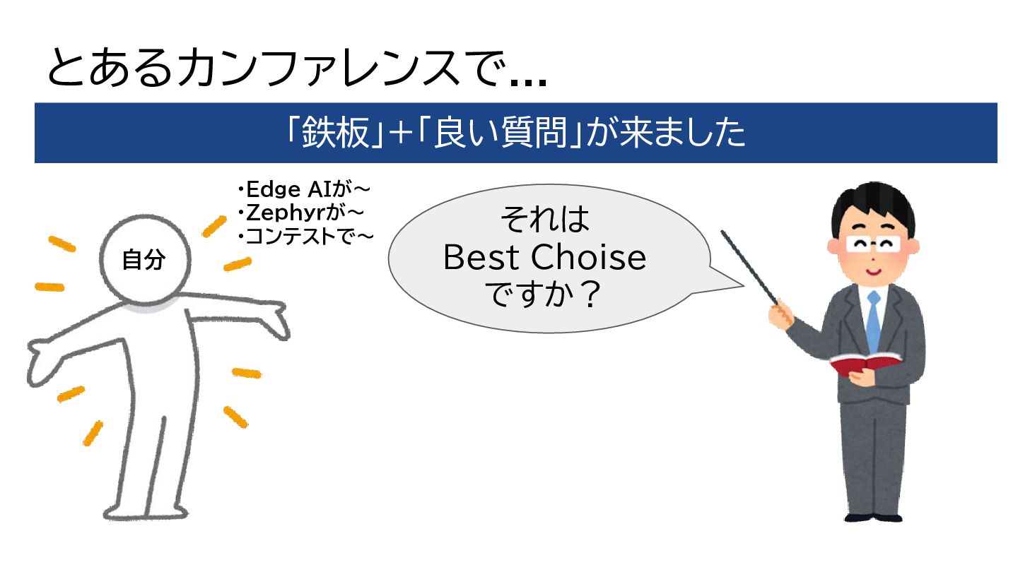 とあるカンファレンスで... 「鉄板」+「良い質問」が来ました ・Edge AIが~ ・Zephyrが~ ・コンテストで~ それは Best Choise ですか?