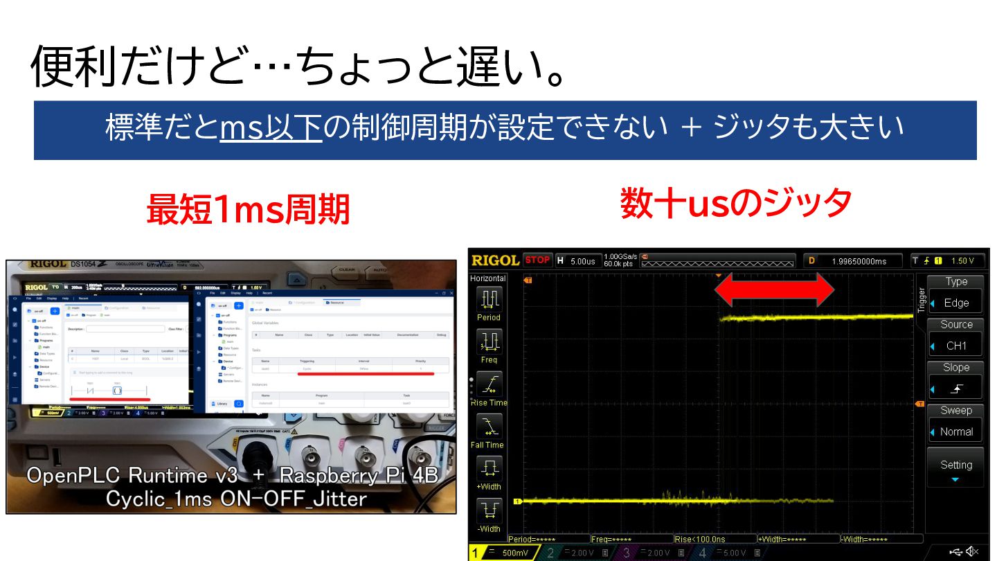便利だけど…ちょっと遅い。 標準だとms以下の制御周期が設定できない + ジッタも大きい 数十usのジッタ 最短1ms周期
