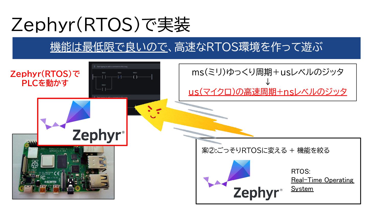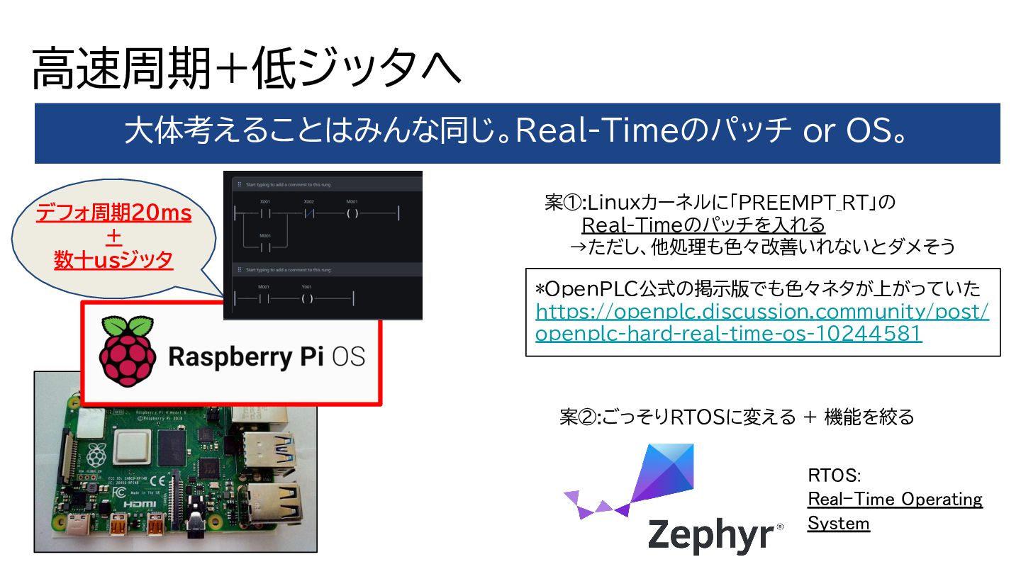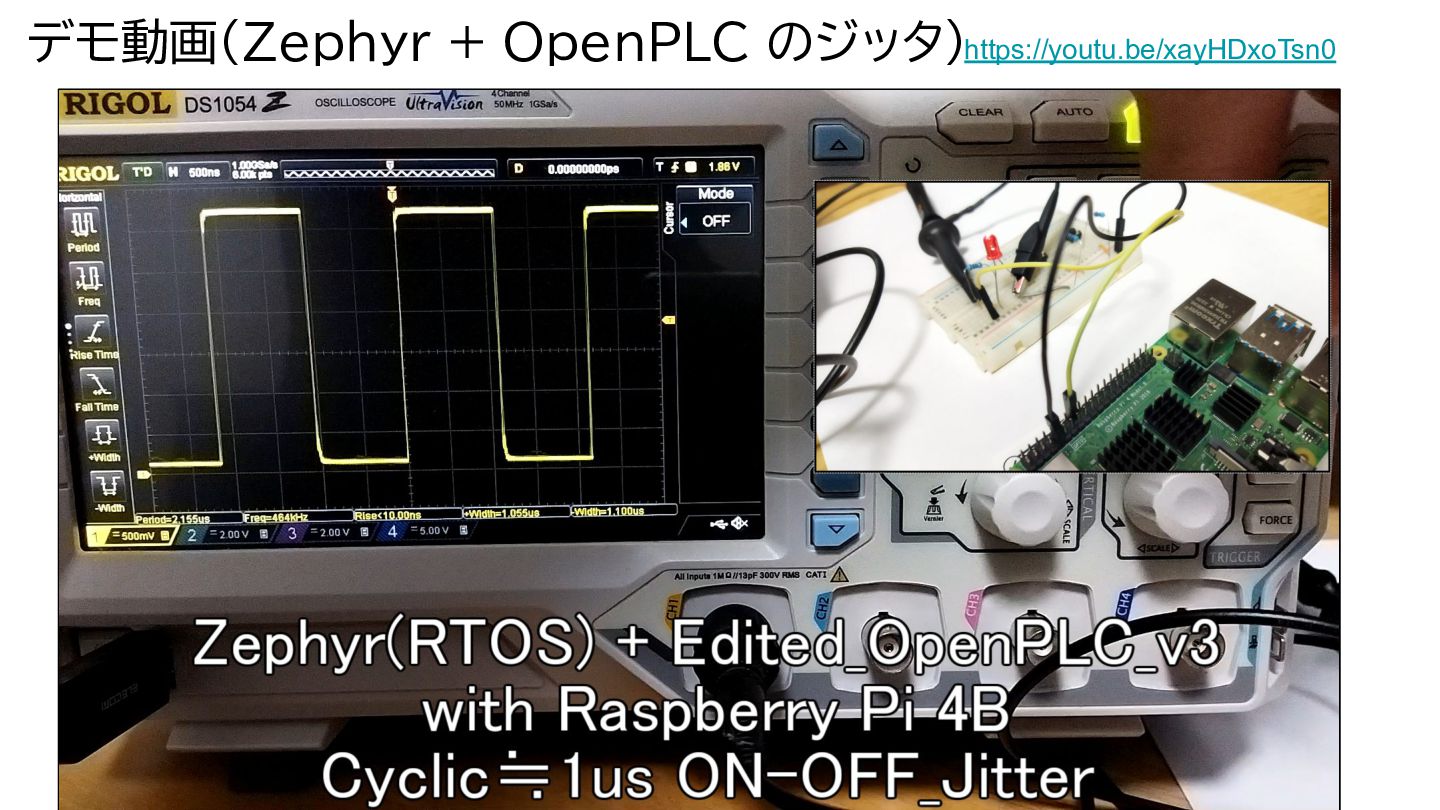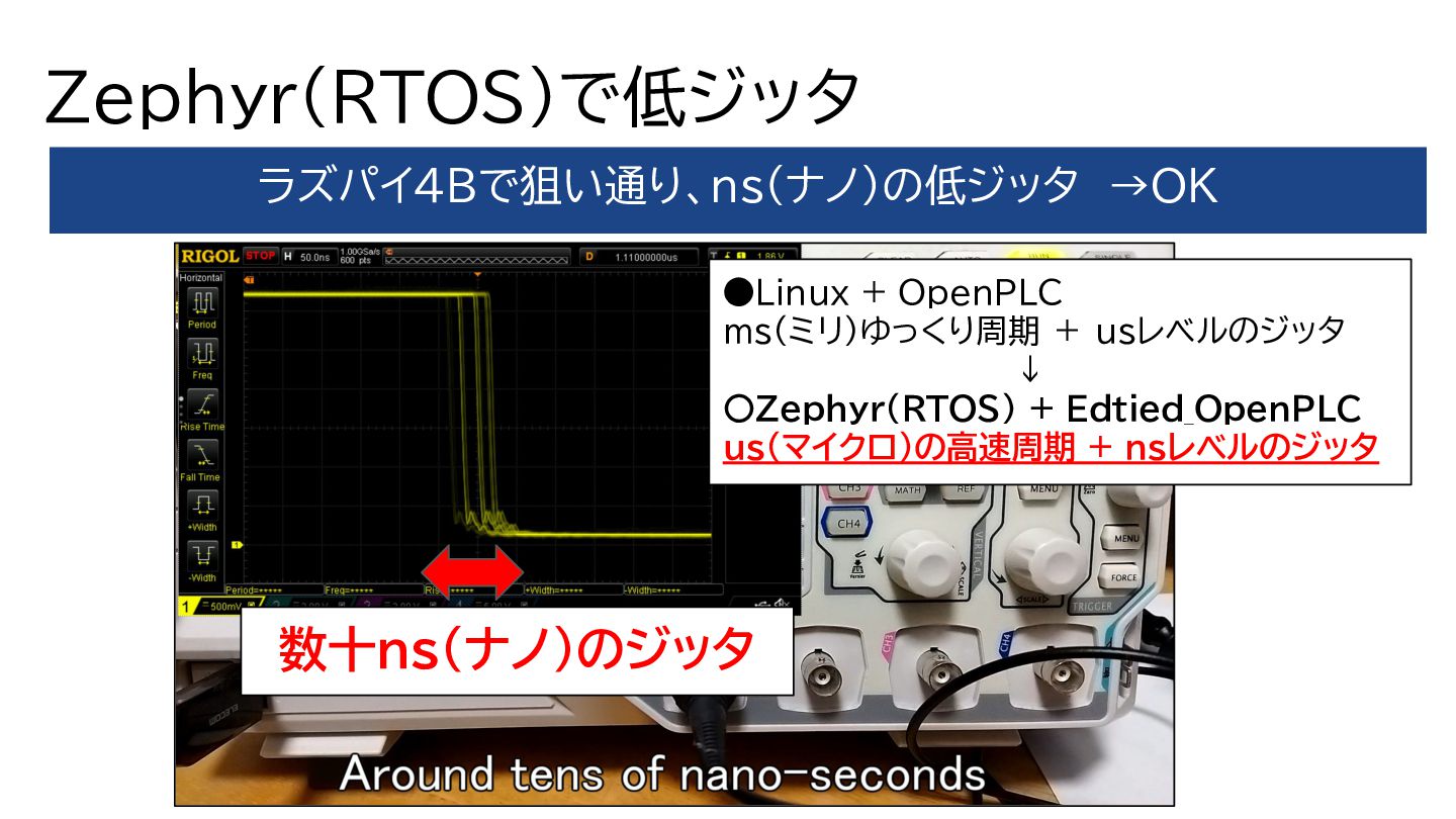 Zephyr(RTOS)で低ジッタ ラズパイ4Bで狙い通り、ns(ナノ)の低ジッタ →OK •Linux + OpenPLC ms(ミリ)ゆっくり周期 + usレベルのジッタ ↓ 〇Zephyr(RTOS)