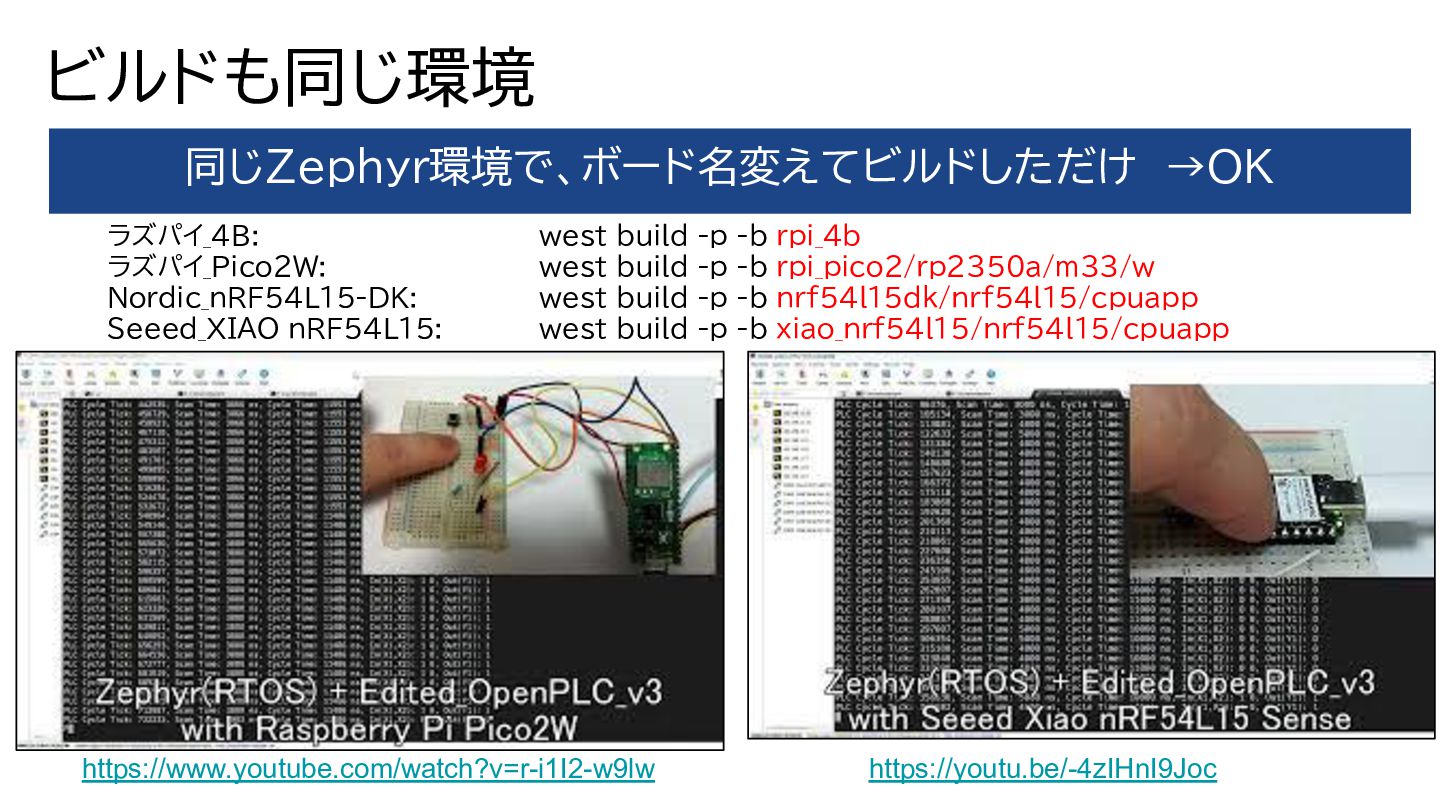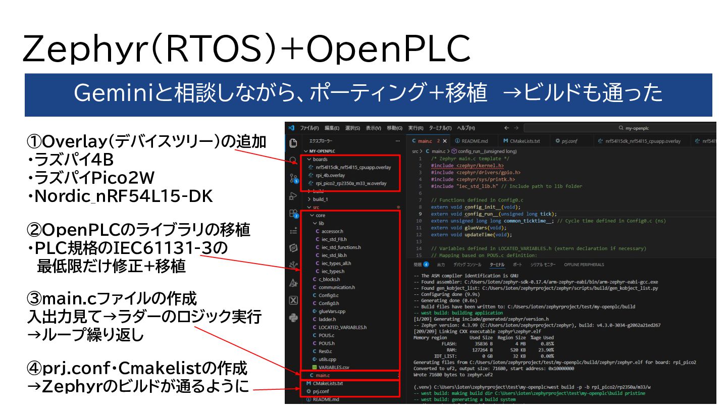 Zephyr(RTOS)+OpenPLC Geminiと相談しながら、ポーティング+移植 →ビルドも通った ①Overlay(デバイスツリー)の追加 ・ラズパイ4B ・ラズパイPico2W ・Nordic_nRF54L15-DK ②OpenPLCのライブラリの移植 ・PLC規格のIEC61131-3の 最低限だけ修正+移植 ③main.cファイルの作成