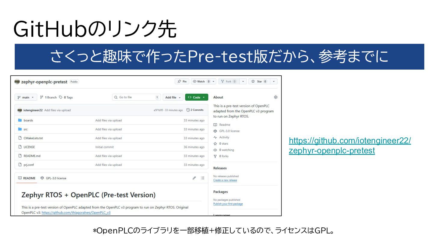 GitHubのリンク先 さくっと趣味で作ったPre-test版だから、参考までに *OpenPLCのライブラリを一部移植+修正しているので、ライセンスはGPL。 https://github.com/iotengineer22/ zephyr-openplc-pretest