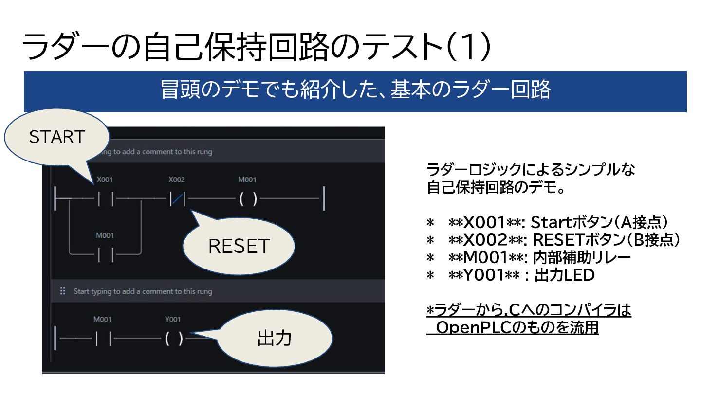 * **M001**: 内部補助リレー * **Y001** : 出力LED *ラダーから.Cへのコンパイラは OpenPLCのものを流用 START RESET 出力