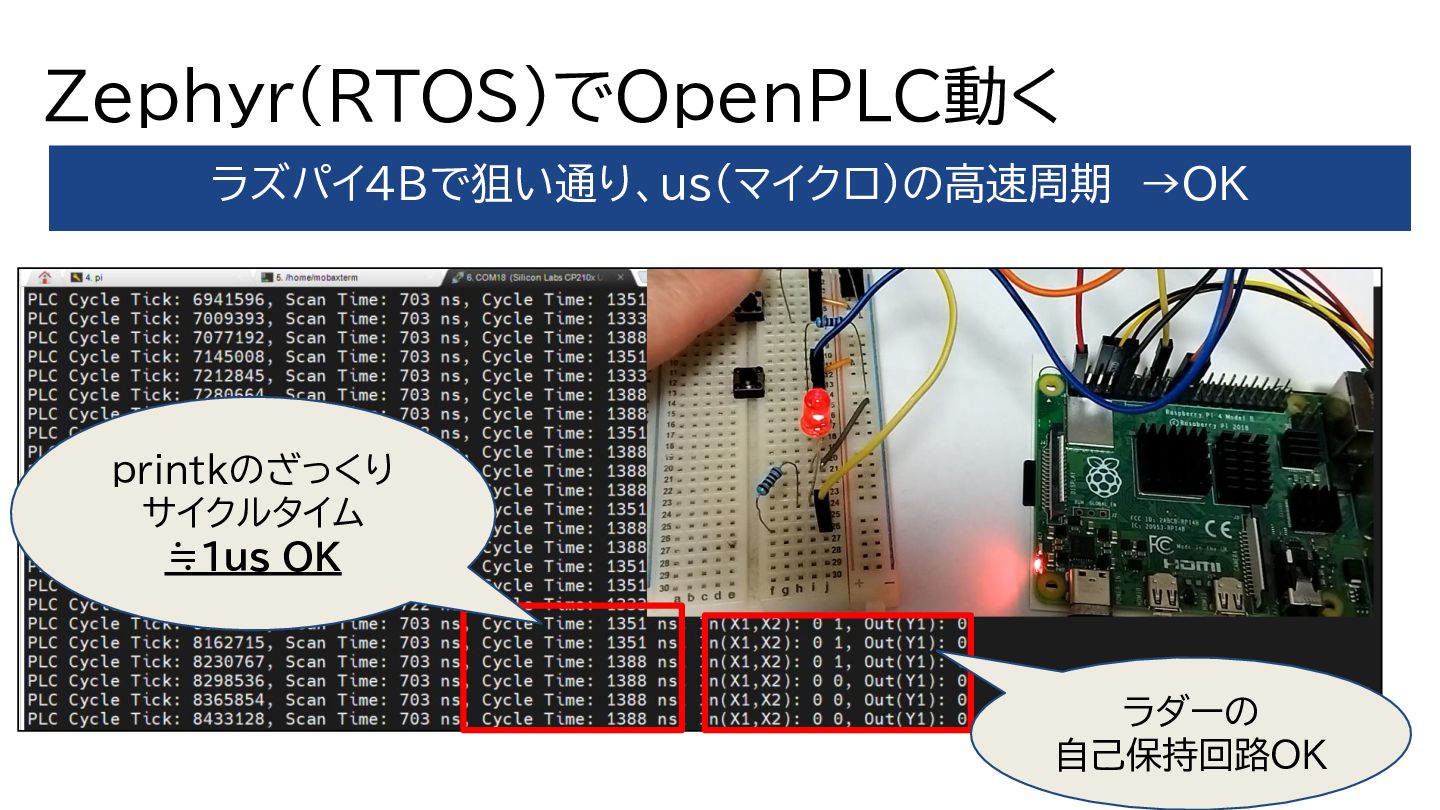 Zephyr(RTOS)でOpenPLC動く ラズパイ4Bで狙い通り、us(マイクロ)の高速周期 →OK printkのざっくり サイクルタイム ≒1us OK ラダーの 自己保持回路OK