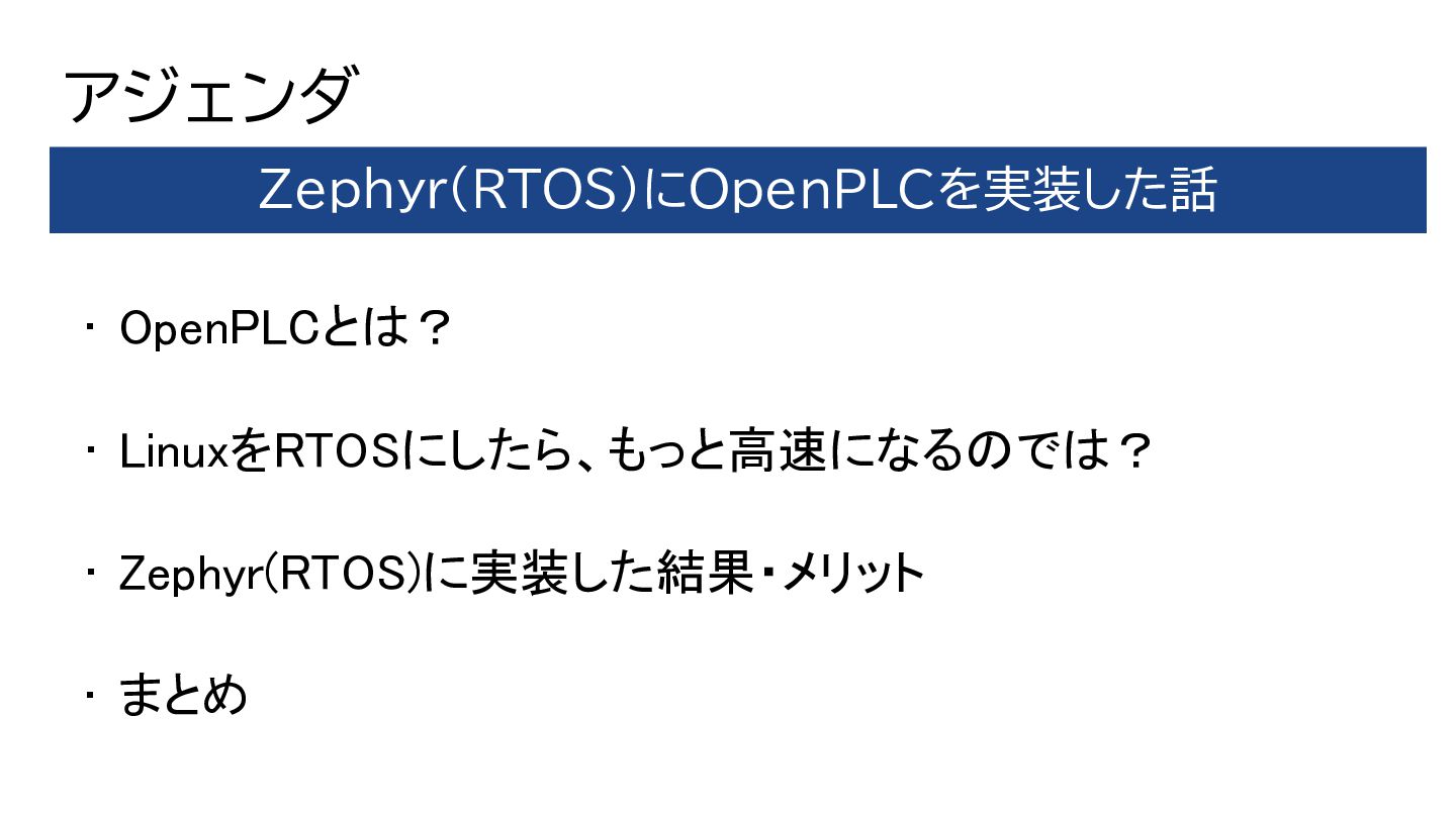 アジェンダ • OpenPLCとは? • LinuxをRTOSにしたら、もっと高速になるのでは? • Zephyr(RTOS)に実装した結果・メリット • まとめ Zephyr(RTOS)にOpenPLCを実装した話