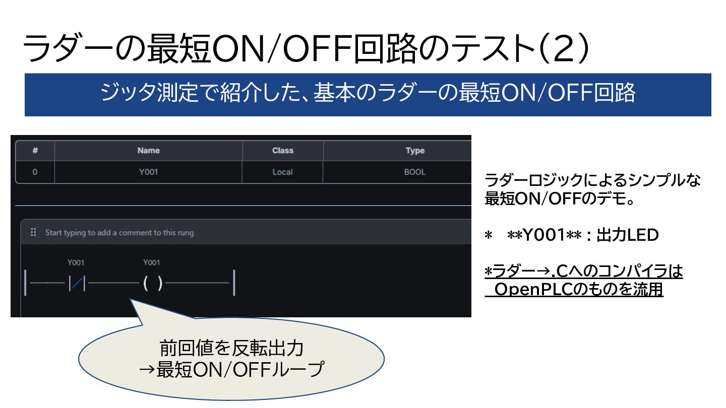 ラダーの最短ON/OFF回路のテスト(2) ジッタ測定で紹介した、基本のラダーの最短ON/OFF回路 ラダーロジックによるシンプルな 最短ON/OFFのデモ。 * **Y001** : 出力LED *ラダー→.Cへのコンパイラは OpenPLCのものを流用