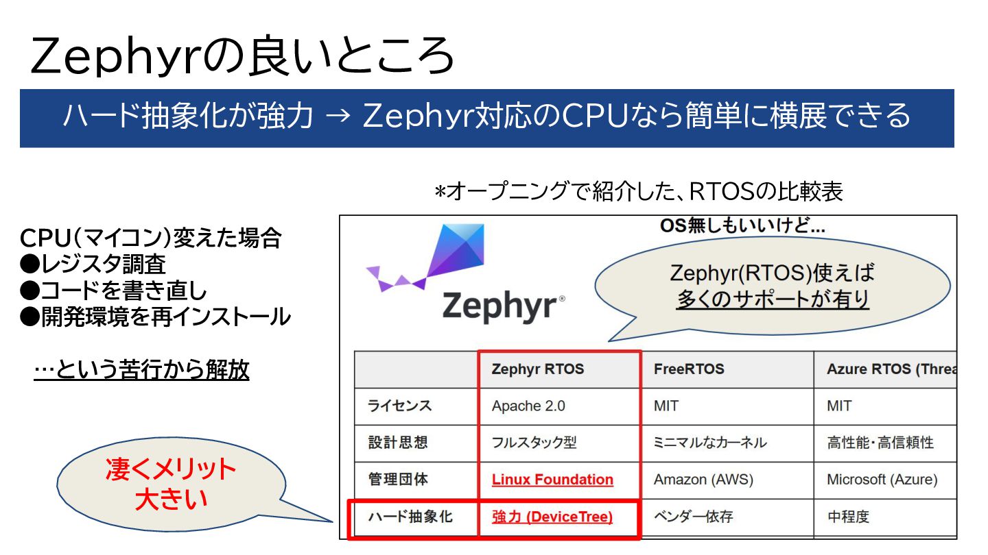 Zephyrの良いところ 凄くメリット 大きい *オープニングで紹介した、RTOSの比較表 ハード抽象化が強力 → Zephyr対応のCPUなら簡単に横展できる CPU(マイコン)変えた場合 •レジスタ調査 •コードを書き直し