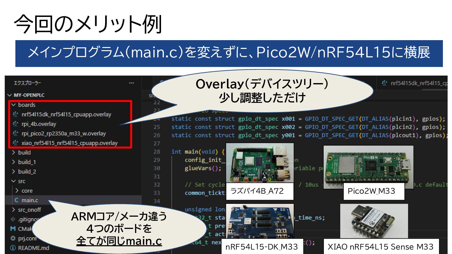 今回のメリット例 メインプログラム(main.c)を変えずに、Pico2W/nRF54L15に横展 ARMコア/メーカ違う 4つのボードを 全てが同じmain.c Overlay(デバイスツリー) 少し調整しただけ ラズパイ4B_A72 Pico2W_M33 nRF54L15-DK_M33