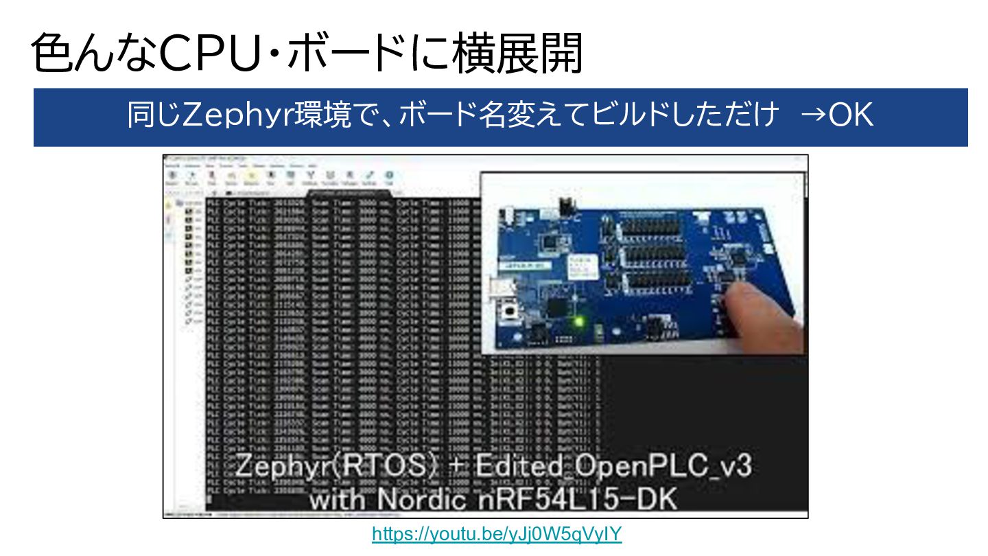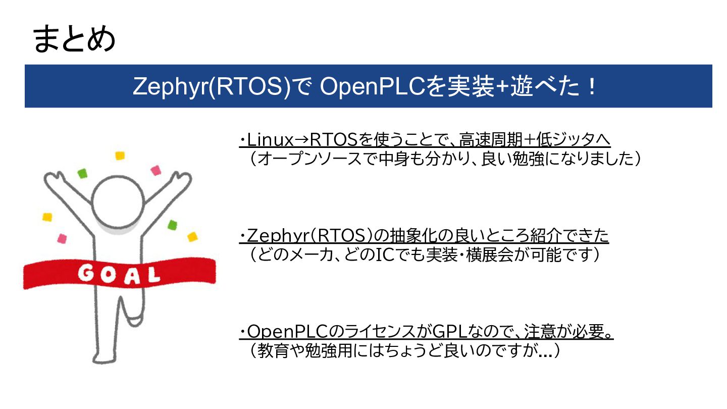 ・Linux→RTOSを使うことで、高速周期+低ジッタへ (オープンソースで中身も分かり、良い勉強になりました) ・Zephyr(RTOS)の抽象化の良いところ紹介できた (どのメーカ、どのICでも実装・横展会が可能です) ・OpenPLCのライセンスがGPLなので、注意が必要。 (教育や勉強用にはちょうど良いのですが...) まとめ Zephyr(RTOS)で OpenPLCを実装+遊べた!