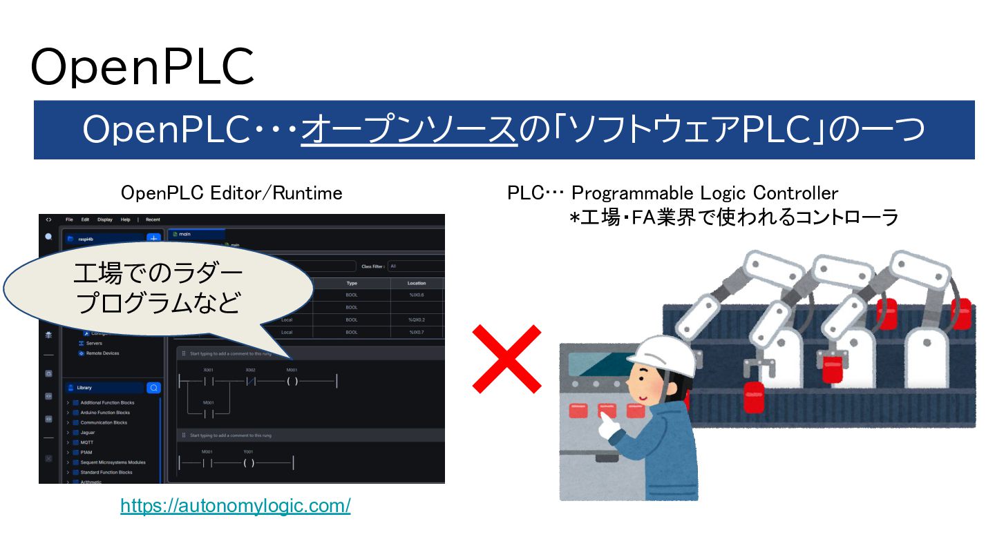 OpenPLC OpenPLC・・・オープンソースの「ソフトウェアPLC」の一つ PLC… Programmable Logic Controller *工場・FA業界で使われるコントローラ + https://autonomylogic.com/ OpenPLC