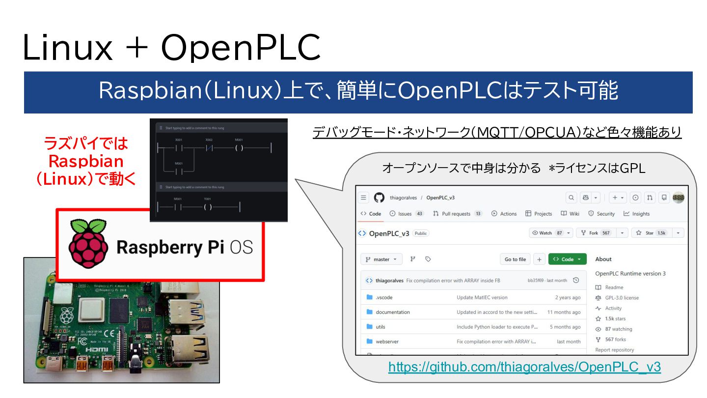 Linux + OpenPLC Raspbian(Linux)上で、簡単にOpenPLCはテスト可能 https://github.com/thiagoralves/OpenPLC_v3 オープンソースで中身は分かる *ライセンスはGPL デバッグモード・ネットワーク(MQTT/OPCUA)など色々機能あり ラズパイでは Raspbian (Linux)で動く