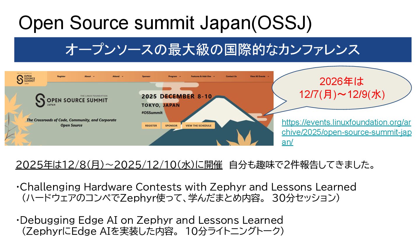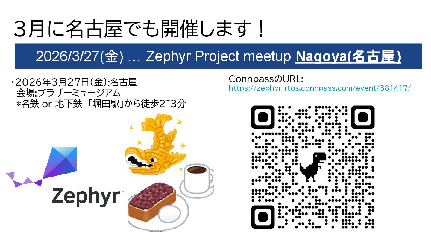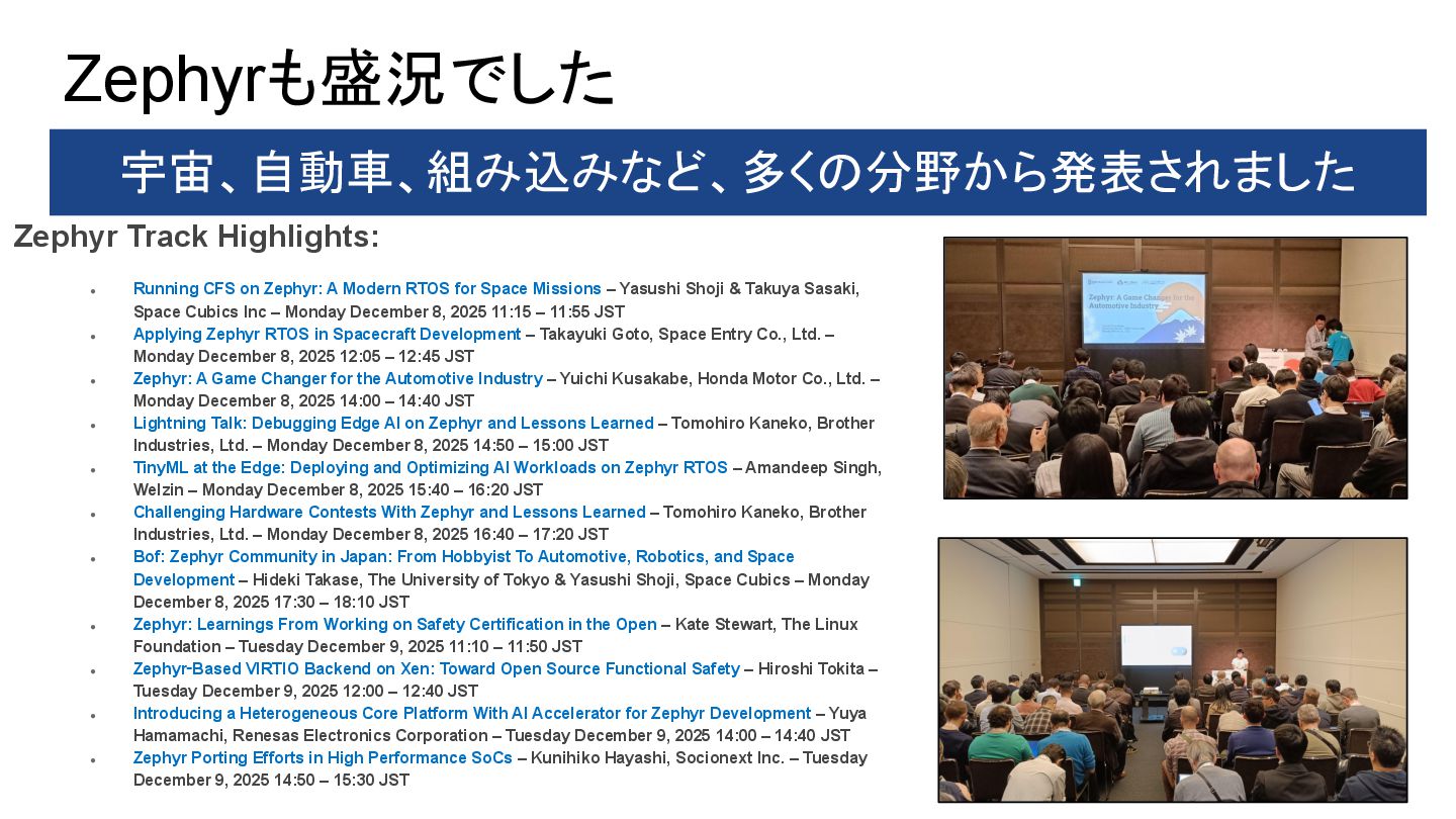A Modern RTOS for Space Missions – Yasushi Shoji & Takuya Sasaki, Space Cubics Inc – Monday December 8, 2025 11:15 – 11:55 JST • Applying Zephyr RTOS in Spacecraft Development – Takayuki Goto, Space Entry Co., Ltd. – Monday December 8, 2025 12:05 – 12:45 JST • Zephyr: A Game Changer for the Automotive Industry – Yuichi Kusakabe, Honda Motor Co., Ltd. – Monday December 8, 2025 14:00 – 14:40 JST • Lightning Talk: Debugging Edge AI on Zephyr and Lessons Learned – Tomohiro Kaneko, Brother Industries, Ltd. – Monday December 8, 2025 14:50 – 15:00 JST • TinyML at the Edge: Deploying and Optimizing AI Workloads on Zephyr RTOS – Amandeep Singh, Welzin – Monday December 8, 2025 15:40 – 16:20 JST • Challenging Hardware Contests With Zephyr and Lessons Learned – Tomohiro Kaneko, Brother Industries, Ltd. – Monday December 8, 2025 16:40 – 17:20 JST • Bof: Zephyr Community in Japan: From Hobbyist To Automotive, Robotics, and Space Development – Hideki Takase, The University of Tokyo & Yasushi Shoji, Space Cubics – Monday December 8, 2025 17:30 – 18:10 JST • Zephyr: Learnings From Working on Safety Certification in the Open – Kate Stewart, The Linux Foundation – Tuesday December 9, 2025 11:10 – 11:50 JST • Zephyr‑Based VIRTIO Backend on Xen: Toward Open Source Functional Safety – Hiroshi Tokita – Tuesday December 9, 2025 12:00 – 12:40 JST • Introducing a Heterogeneous Core Platform With AI Accelerator for Zephyr Development – Yuya Hamamachi, Renesas Electronics Corporation – Tuesday December 9, 2025 14:00 – 14:40 JST • Zephyr Porting Efforts in High Performance SoCs – Kunihiko Hayashi, Socionext Inc. – Tuesday December 9, 2025 14:50 – 15:30 JST
