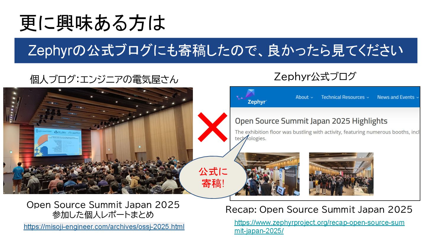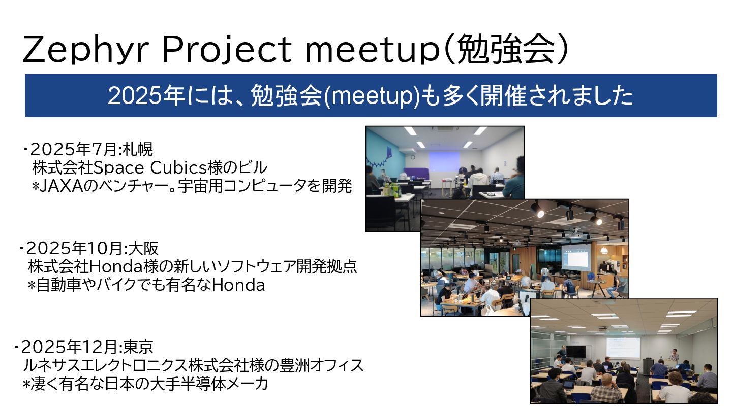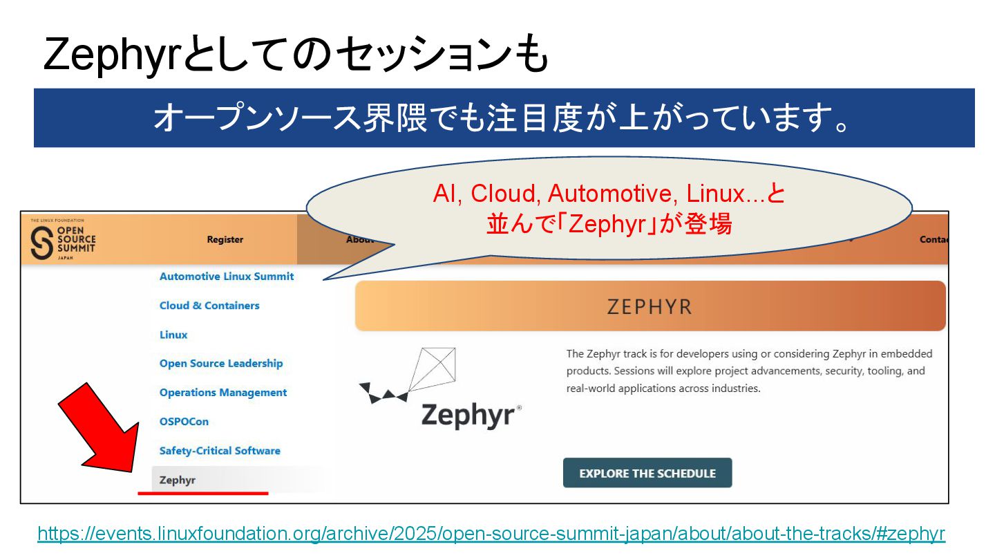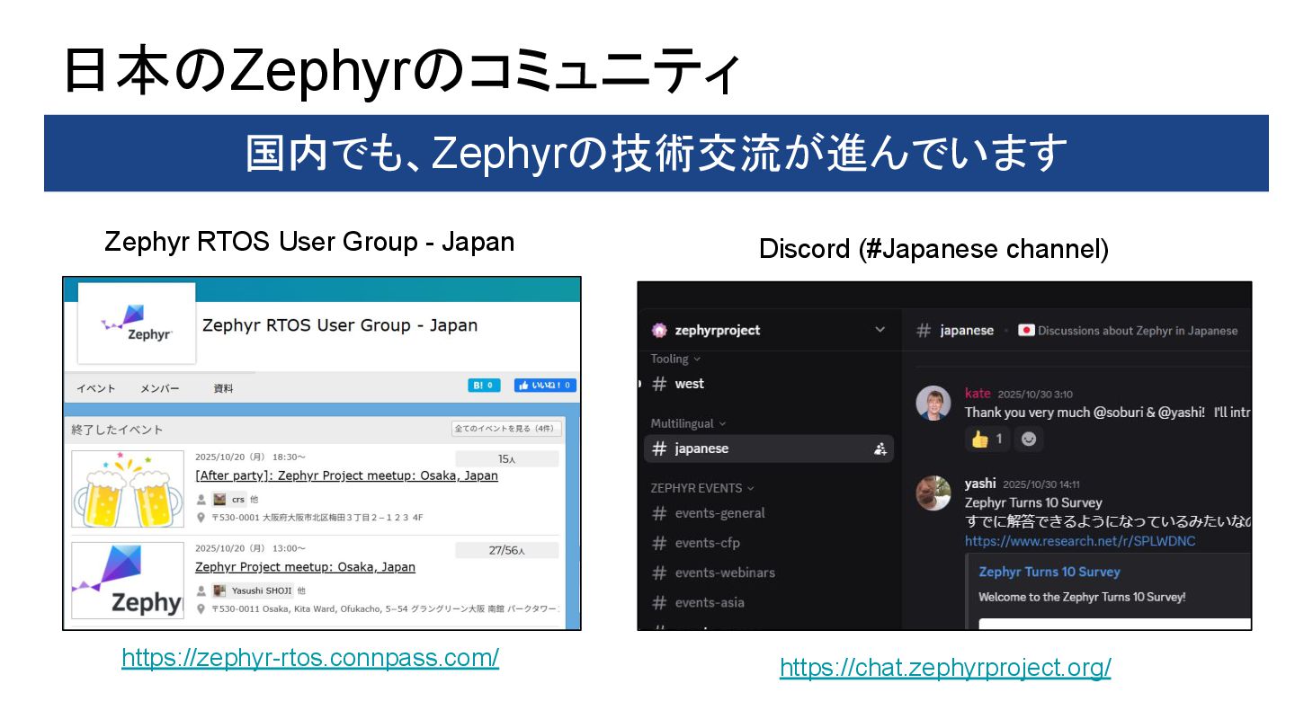 A Modern RTOS for Space Missions – Yasushi Shoji & Takuya Sasaki, Space Cubics Inc – Monday December 8, 2025 11:15 – 11:55 JST • Applying Zephyr RTOS in Spacecraft Development – Takayuki Goto, Space Entry Co., Ltd. – Monday December 8, 2025 12:05 – 12:45 JST • Zephyr: A Game Changer for the Automotive Industry – Yuichi Kusakabe, Honda Motor Co., Ltd. – Monday December 8, 2025 14:00 – 14:40 JST • Lightning Talk: Debugging Edge AI on Zephyr and Lessons Learned – Tomohiro Kaneko, Brother Industries, Ltd. – Monday December 8, 2025 14:50 – 15:00 JST • TinyML at the Edge: Deploying and Optimizing AI Workloads on Zephyr RTOS – Amandeep Singh, Welzin – Monday December 8, 2025 15:40 – 16:20 JST • Challenging Hardware Contests With Zephyr and Lessons Learned – Tomohiro Kaneko, Brother Industries, Ltd. – Monday December 8, 2025 16:40 – 17:20 JST • Bof: Zephyr Community in Japan: From Hobbyist To Automotive, Robotics, and Space Development – Hideki Takase, The University of Tokyo & Yasushi Shoji, Space Cubics – Monday December 8, 2025 17:30 – 18:10 JST • Zephyr: Learnings From Working on Safety Certification in the Open – Kate Stewart, The Linux Foundation – Tuesday December 9, 2025 11:10 – 11:50 JST • Zephyr‑Based VIRTIO Backend on Xen: Toward Open Source Functional Safety – Hiroshi Tokita – Tuesday December 9, 2025 12:00 – 12:40 JST • Introducing a Heterogeneous Core Platform With AI Accelerator for Zephyr Development – Yuya Hamamachi, Renesas Electronics Corporation – Tuesday December 9, 2025 14:00 – 14:40 JST • Zephyr Porting Efforts in High Performance SoCs – Kunihiko Hayashi, Socionext Inc. – Tuesday December 9, 2025 14:50 – 15:30 JST