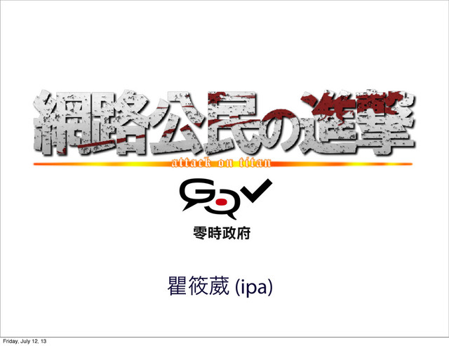 ෆཁҝॄኄᔒ༗ਓ࡞Ṝݸɼ g0v motto ઌঝೝ㟬बੋʮᔒ༗ਓʯʂ ʮᔒ༗ਓʯੋᤈೳతʂ Friday, July 12, 13