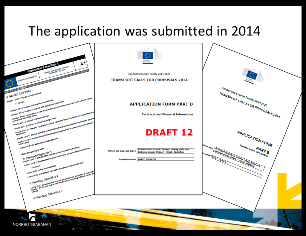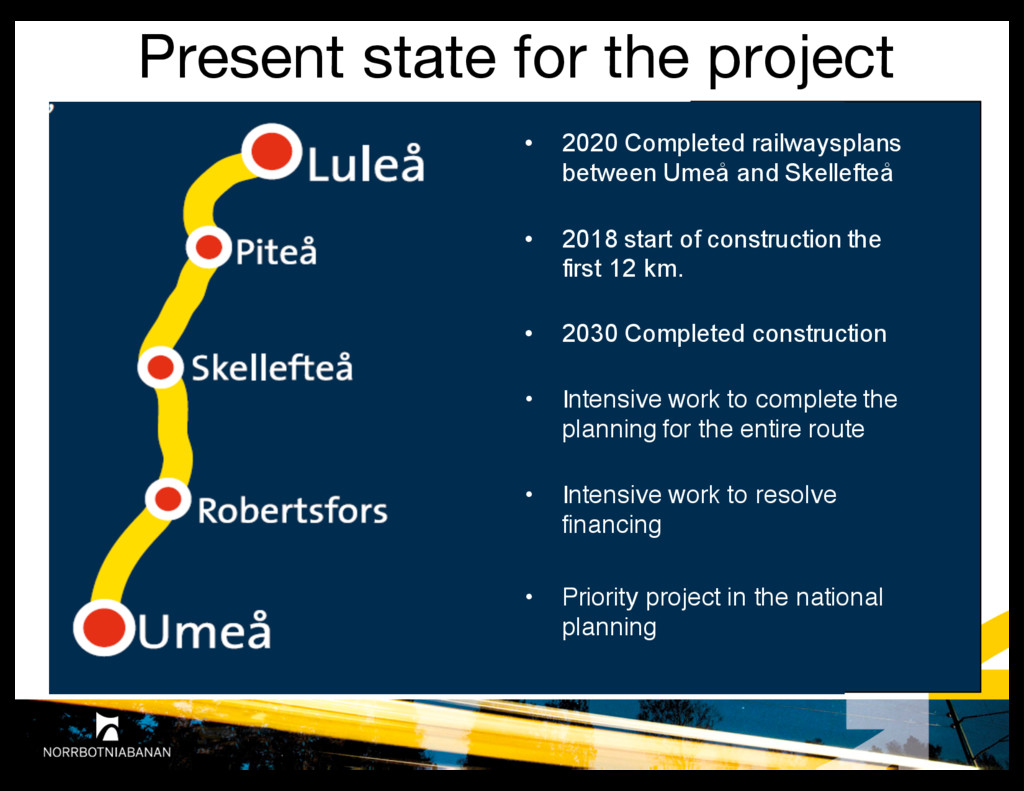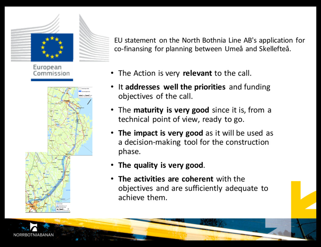for co-‐finansing for planning between Umeå and Skellefteå. • The Action is very relevant to the call. • It addresses well the priorities and funding objectives of the call. • The maturity is very good since it is, from a technical point of view, ready to go. • The impact is very good as it will be used as a decision-‐making tool for the construction phase. • The quality is very good. • The activities are coherent with the objectives and are sufficiently adequate to achieve them.