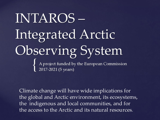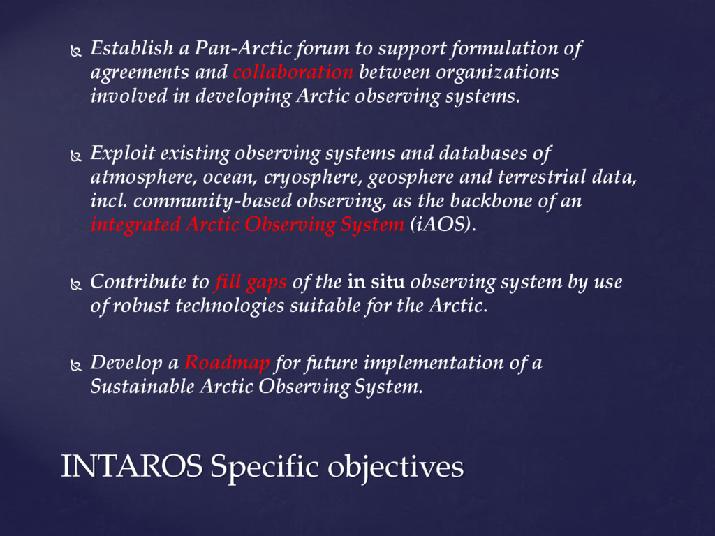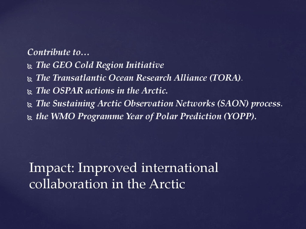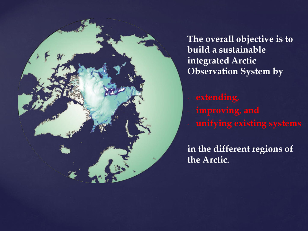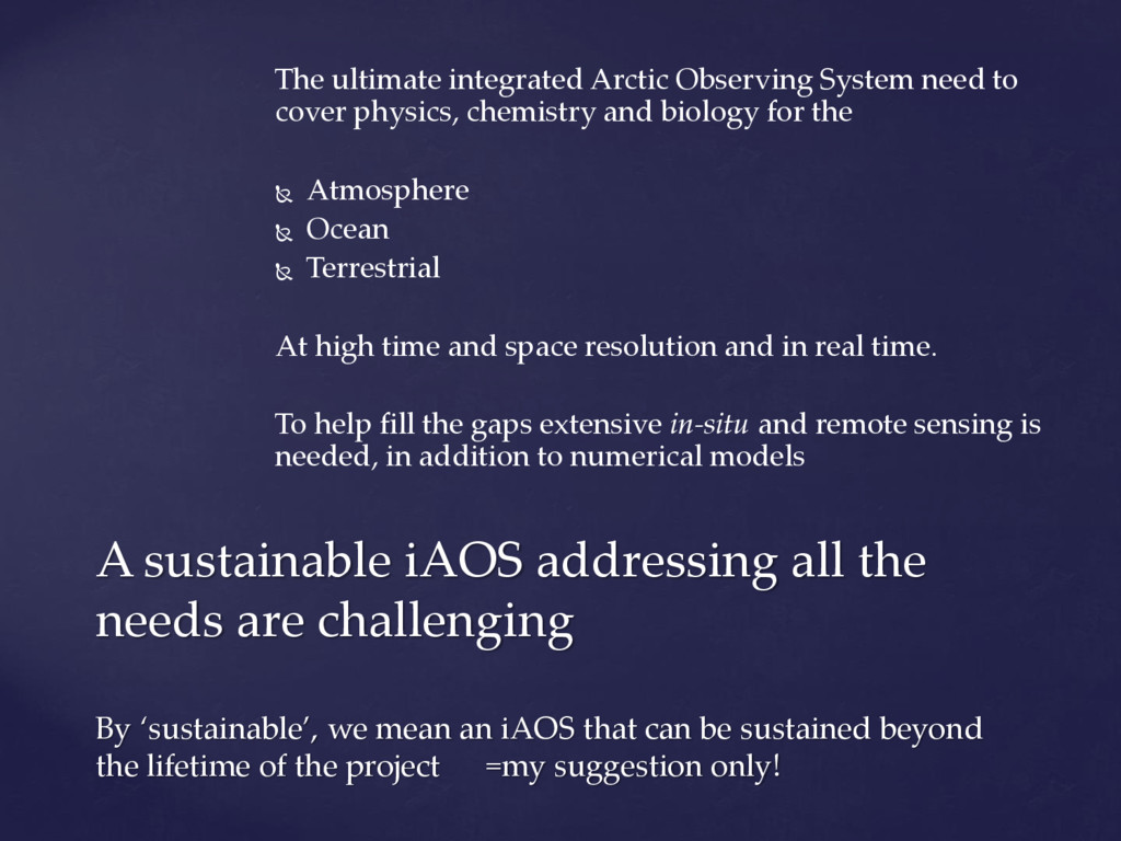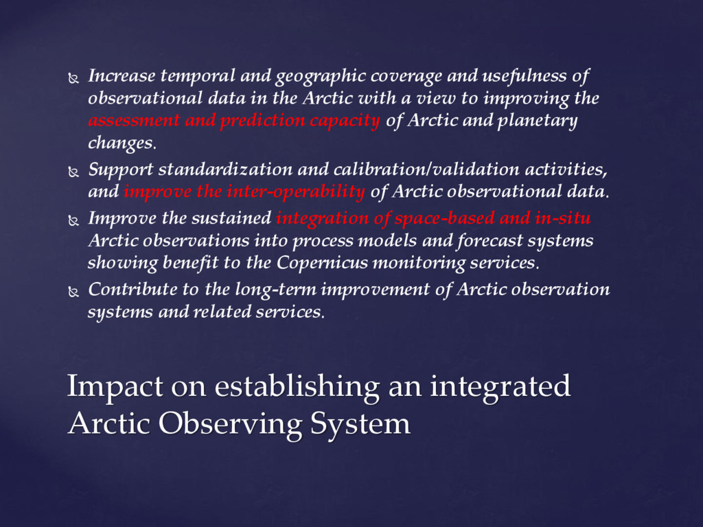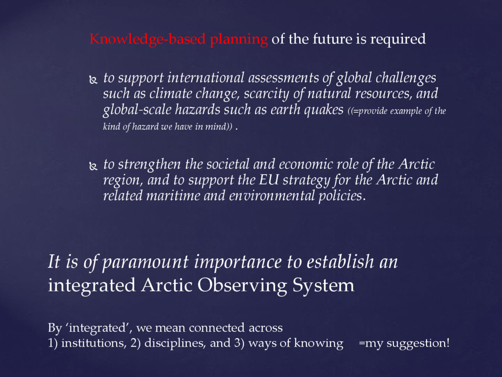 international assessments of global challenges such as climate change, scarcity of natural resources, and global-scale hazards such as earth quakes ((=provide example of the kind of hazard we have in mind)) . to strengthen the societal and economic role of the Arctic region, and to support the EU strategy for the Arctic and related maritime and environmental policies. It is of paramount importance to establish an integrated Arctic Observing System By ‘integrated’, we mean connected across 1) institutions, 2) disciplines, and 3) ways of knowing =my suggestion!