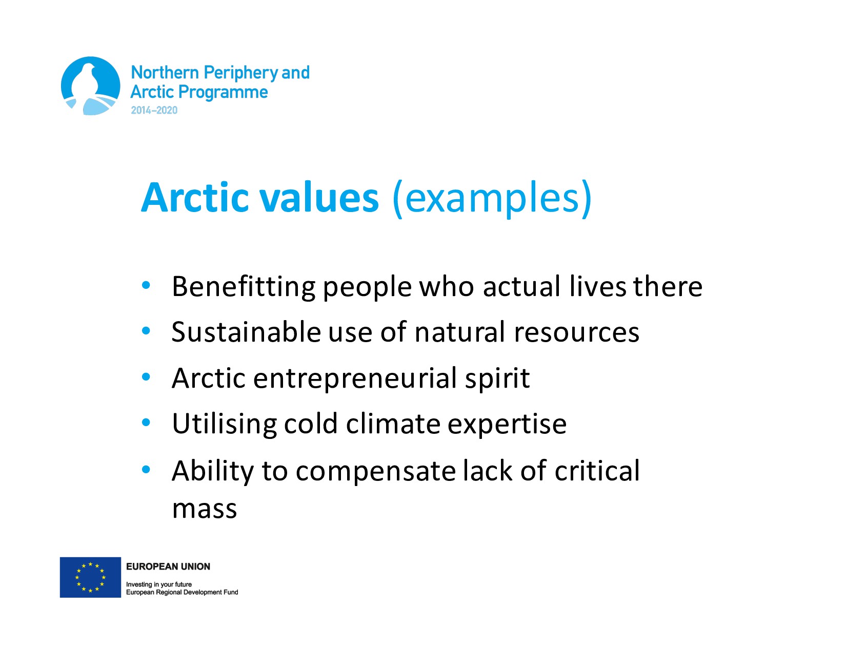 • Sustainable use of natural resources • Arctic entrepreneurial spirit • Utilising cold climate expertise • Ability to compensate lack of critical mass