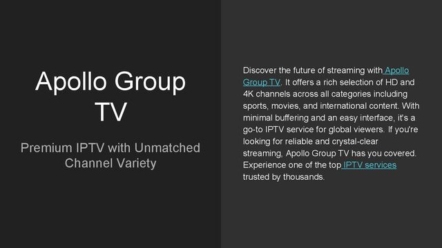the future of streaming with Apollo Group TV. It offers a rich selection of HD and 4K channels across all categories including sports, movies, and international content. With minimal buffering and an easy interface, it's a go-to IPTV service for global viewers. If you're looking for reliable and crystal-clear streaming, Apollo Group TV has you covered. Experience one of the top IPTV services trusted by thousands.