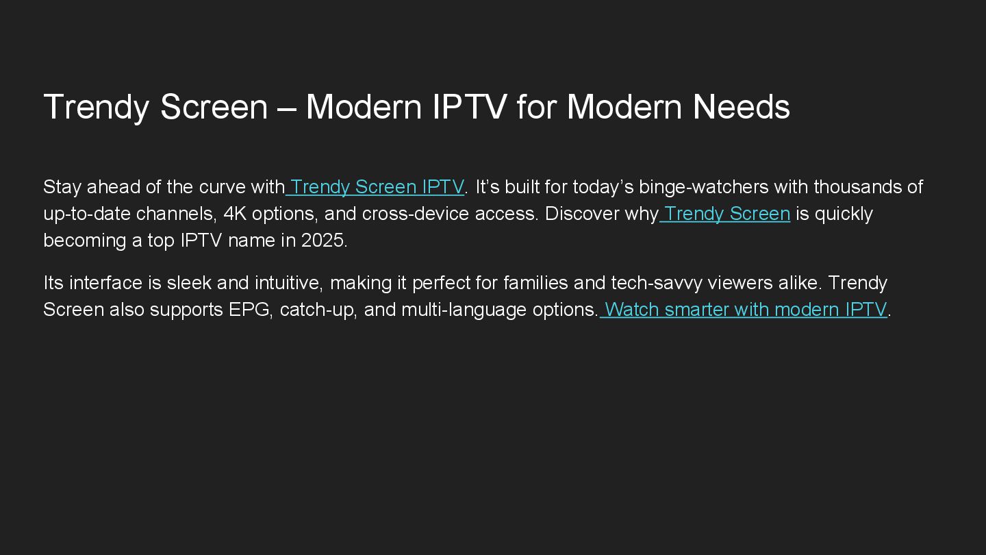 of the curve with Trendy Screen IPTV. It’s built for today’s binge-watchers with thousands of up-to-date channels, 4K options, and cross-device access. Discover why Trendy Screen is quickly becoming a top IPTV name in 2025. Its interface is sleek and intuitive, making it perfect for families and tech-savvy viewers alike. Trendy Screen also supports EPG, catch-up, and multi-language options. Watch smarter with modern IPTV.