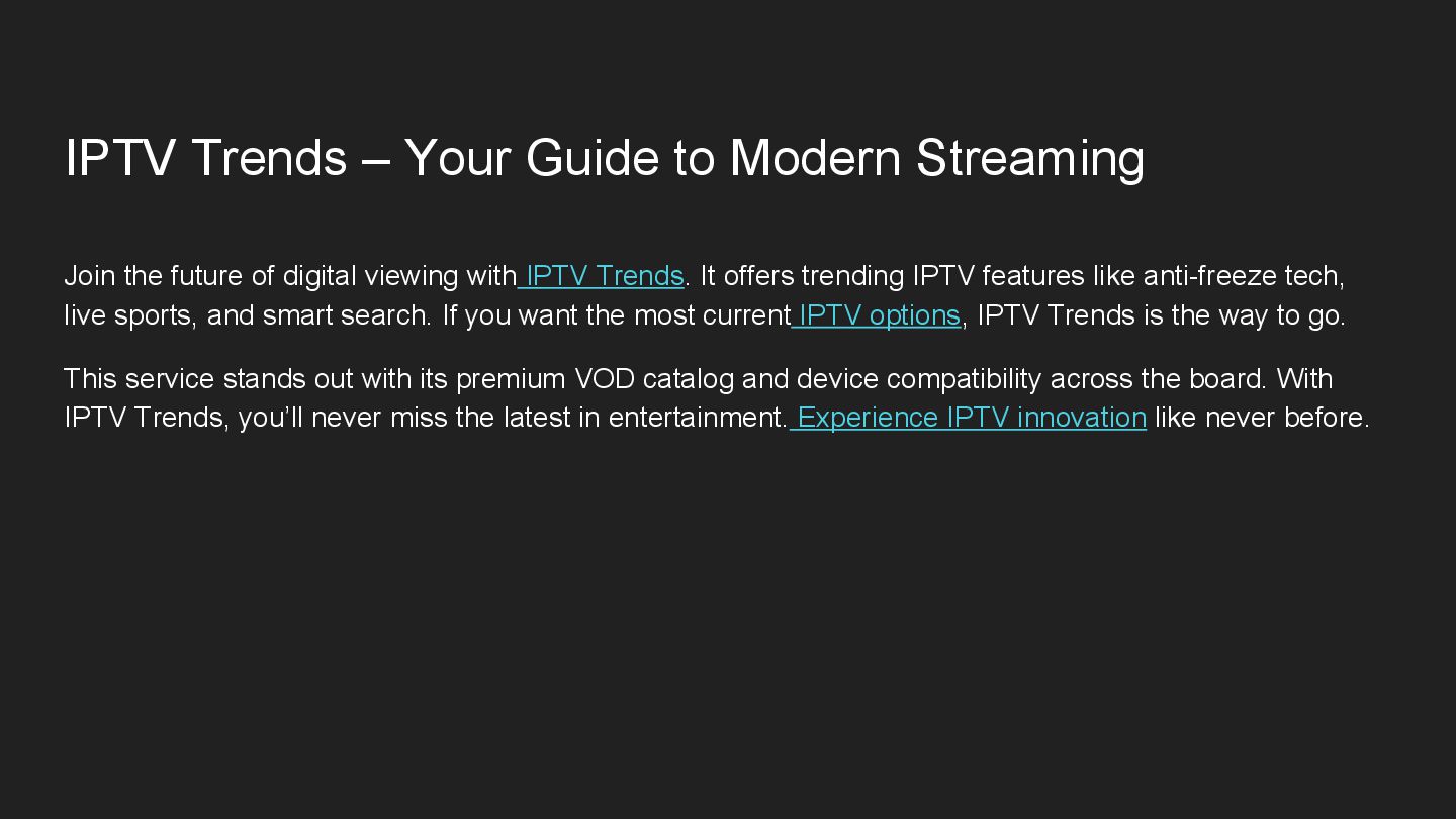 future of digital viewing with IPTV Trends. It offers trending IPTV features like anti-freeze tech, live sports, and smart search. If you want the most current IPTV options, IPTV Trends is the way to go. This service stands out with its premium VOD catalog and device compatibility across the board. With IPTV Trends, you’ll never miss the latest in entertainment. Experience IPTV innovation like never before.