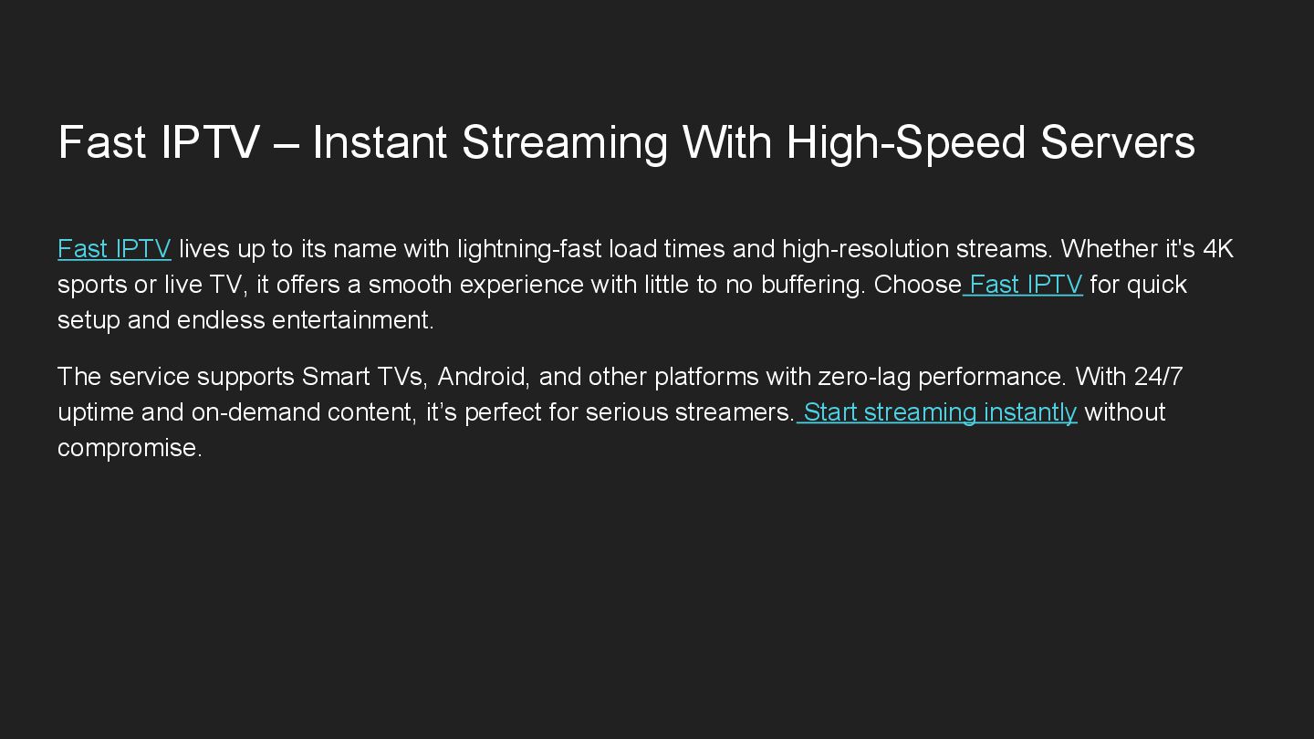 lives up to its name with lightning-fast load times and high-resolution streams. Whether it's 4K sports or live TV, it offers a smooth experience with little to no buffering. Choose Fast IPTV for quick setup and endless entertainment. The service supports Smart TVs, Android, and other platforms with zero-lag performance. With 24/7 uptime and on-demand content, it’s perfect for serious streamers. Start streaming instantly without compromise.