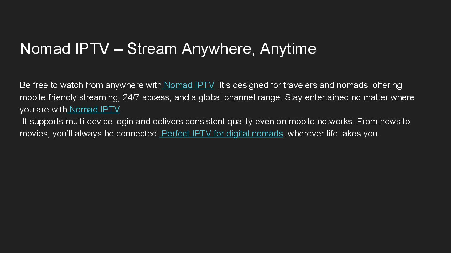 from anywhere with Nomad IPTV. It’s designed for travelers and nomads, offering mobile-friendly streaming, 24/7 access, and a global channel range. Stay entertained no matter where you are with Nomad IPTV. It supports multi-device login and delivers consistent quality even on mobile networks. From news to movies, you’ll always be connected. Perfect IPTV for digital nomads, wherever life takes you.