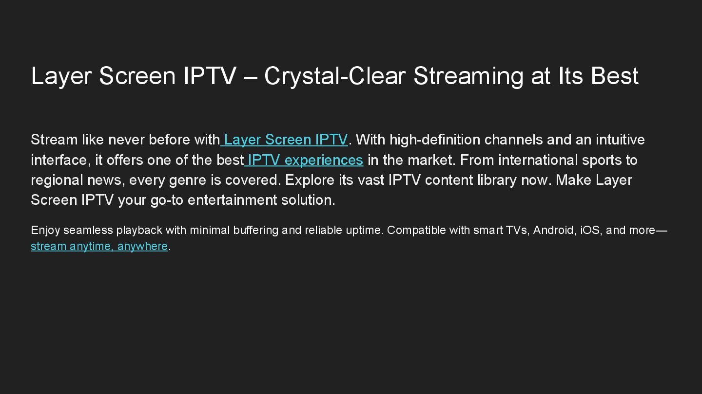 like never before with Layer Screen IPTV. With high-definition channels and an intuitive interface, it offers one of the best IPTV experiences in the market. From international sports to regional news, every genre is covered. Explore its vast IPTV content library now. Make Layer Screen IPTV your go-to entertainment solution. Enjoy seamless playback with minimal buffering and reliable uptime. Compatible with smart TVs, Android, iOS, and more— stream anytime, anywhere.