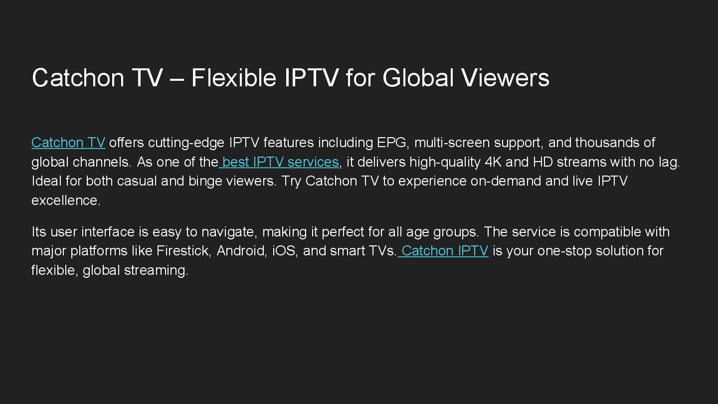 offers cutting-edge IPTV features including EPG, multi-screen support, and thousands of global channels. As one of the best IPTV services, it delivers high-quality 4K and HD streams with no lag. Ideal for both casual and binge viewers. Try Catchon TV to experience on-demand and live IPTV excellence. Its user interface is easy to navigate, making it perfect for all age groups. The service is compatible with major platforms like Firestick, Android, iOS, and smart TVs. Catchon IPTV is your one-stop solution for flexible, global streaming.