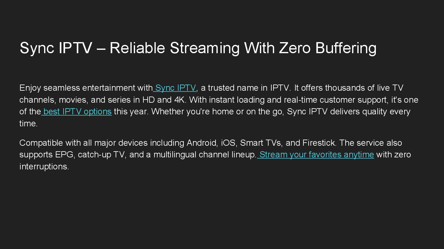 entertainment with Sync IPTV, a trusted name in IPTV. It offers thousands of live TV channels, movies, and series in HD and 4K. With instant loading and real-time customer support, it's one of the best IPTV options this year. Whether you're home or on the go, Sync IPTV delivers quality every time. Compatible with all major devices including Android, iOS, Smart TVs, and Firestick. The service also supports EPG, catch-up TV, and a multilingual channel lineup. Stream your favorites anytime with zero interruptions.