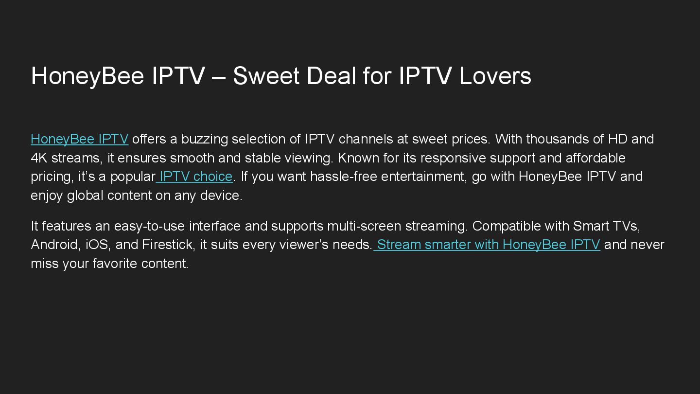 offers a buzzing selection of IPTV channels at sweet prices. With thousands of HD and 4K streams, it ensures smooth and stable viewing. Known for its responsive support and affordable pricing, it’s a popular IPTV choice. If you want hassle-free entertainment, go with HoneyBee IPTV and enjoy global content on any device. It features an easy-to-use interface and supports multi-screen streaming. Compatible with Smart TVs, Android, iOS, and Firestick, it suits every viewer’s needs. Stream smarter with HoneyBee IPTV and never miss your favorite content.