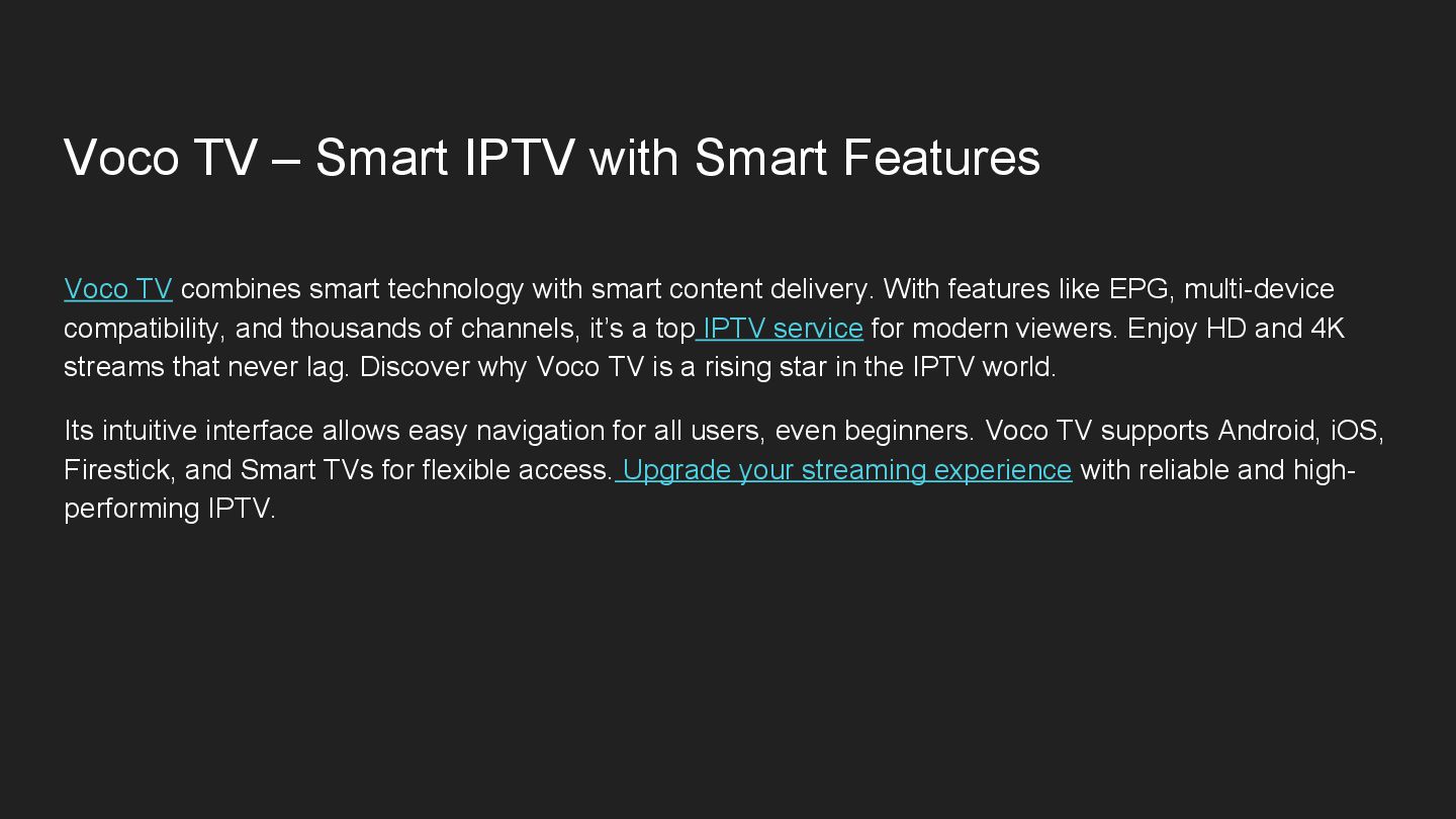 combines smart technology with smart content delivery. With features like EPG, multi-device compatibility, and thousands of channels, it’s a top IPTV service for modern viewers. Enjoy HD and 4K streams that never lag. Discover why Voco TV is a rising star in the IPTV world. Its intuitive interface allows easy navigation for all users, even beginners. Voco TV supports Android, iOS, Firestick, and Smart TVs for flexible access. Upgrade your streaming experience with reliable and high- performing IPTV.
