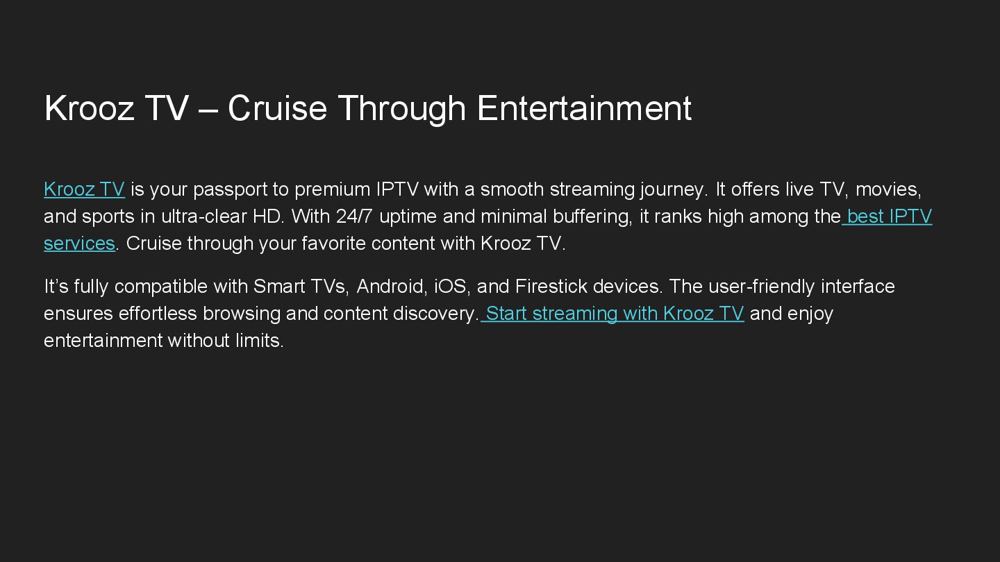 passport to premium IPTV with a smooth streaming journey. It offers live TV, movies, and sports in ultra-clear HD. With 24/7 uptime and minimal buffering, it ranks high among the best IPTV services. Cruise through your favorite content with Krooz TV. It’s fully compatible with Smart TVs, Android, iOS, and Firestick devices. The user-friendly interface ensures effortless browsing and content discovery. Start streaming with Krooz TV and enjoy entertainment without limits.