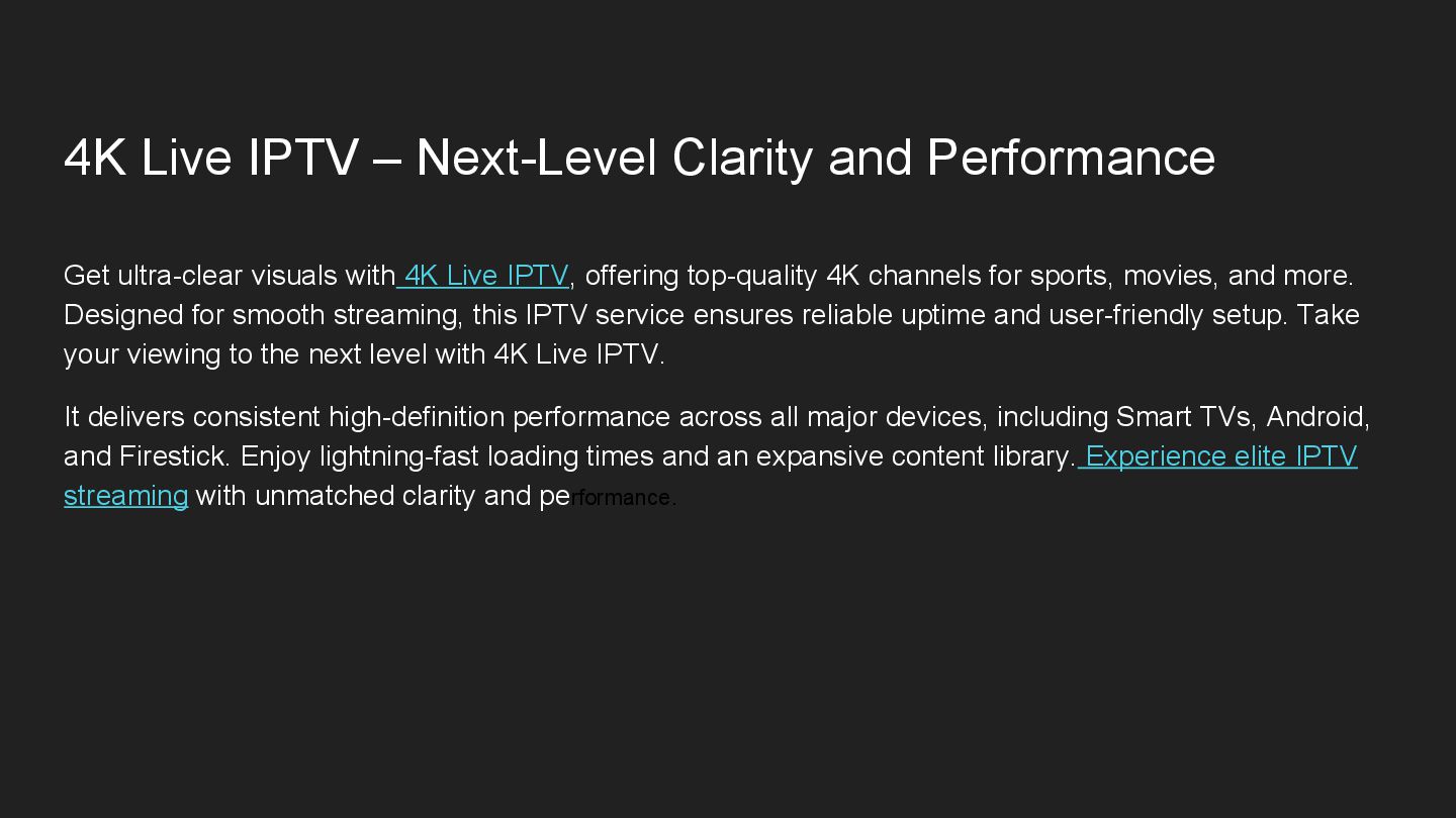 visuals with 4K Live IPTV, offering top-quality 4K channels for sports, movies, and more. Designed for smooth streaming, this IPTV service ensures reliable uptime and user-friendly setup. Take your viewing to the next level with 4K Live IPTV. It delivers consistent high-definition performance across all major devices, including Smart TVs, Android, and Firestick. Enjoy lightning-fast loading times and an expansive content library. Experience elite IPTV streaming with unmatched clarity and performance.
