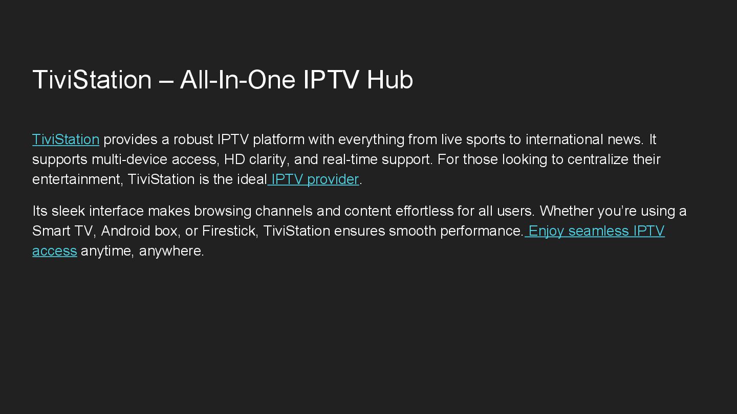 platform with everything from live sports to international news. It supports multi-device access, HD clarity, and real-time support. For those looking to centralize their entertainment, TiviStation is the ideal IPTV provider. Its sleek interface makes browsing channels and content effortless for all users. Whether you’re using a Smart TV, Android box, or Firestick, TiviStation ensures smooth performance. Enjoy seamless IPTV access anytime, anywhere.