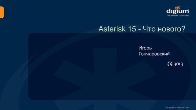 новых RTC клиентах. Широко распространяемые и как никогда независимые от производителя - Web-браузеры • Поддержка нескольких потоков (в частности видео) становится более востребованной • До текущего момента поддерживалось по единственному потоку каждого типа (аудио, видео, текст) Asterisk 15