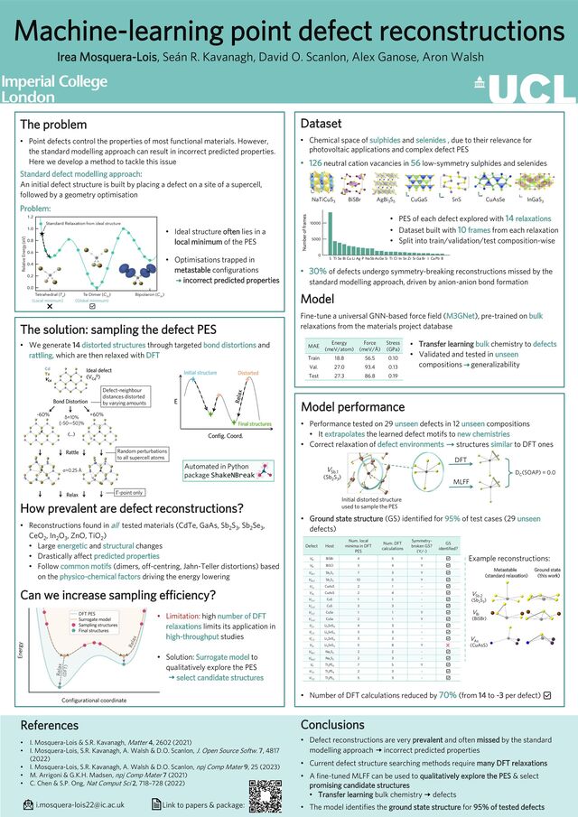 12 unseen compositions • It extrapolates the learned defect motifs to new chemistries • Correct relaxation of defect environments structures similar to DFT ones • Ground state structure (GS) identified for 95% of test cases (29 unseen defects) • Number of DFT calculations reduced by 70% (from 14 to ~3 per defect) ✅ The solution: sampling the defect PES • We generate 14 distorted structures through targeted bond distortions and rattling, which are then relaxed with DFT How prevalent are defect reconstructions? • Reconstructions found in all tested materials (CdTe, GaAs, Sb 2 S 3 , Sb 2 Se 3 , CeO 2 , In 2 O 3 , ZnO, TiO 2 ) • Large energetic and structural changes • Drastically affect predicted properties • Follow common motifs (dimers, off-centring, Jahn-Teller distortions) based on the physico-chemical factors driving the energy lowering Can we increase sampling efficiency? Automated in Python package ShakeNBreak Dataset • Chemical space of sulphides and selenides , due to their relevance for photovoltaic applications and complex defect PES • 126 neutral cation vacancies in 56 low-symmetry sulphides and selenides • 30% of defects undergo symmetry-breaking reconstructions missed by the standard modelling approach, driven by anion-anion bond formation Model Fine-tune a universal GNN-based force field (M3GNet), pre-trained on bulk relaxations from the materials project database Conclusions • Defect reconstructions are very prevalent and often missed by the standard modelling approach incorrect predicted properties • Current defect structure searching methods require many DFT relaxations • A fine-tuned MLFF can be used to qualitatively explore the PES & select promising candidate structures • Transfer learning bulk chemistry defects • The model identifies the ground state structure for 95% of tested defects (Local minimum) (Global minimum) from ideal structure ❌ ✅ Machine-learning point defect reconstructions References • I. Mosquera-Lois & S.R. Kavanagh, Matter 4, 2602 (2021) • I. Mosquera-Lois, S.R. Kavanagh, A. Walsh & D.O. Scanlon, J. Open Source Softw. 7, 4817 (2022) • I. Mosquera-Lois, S.R. Kavanagh, A. Walsh & D.O. Scanlon, npj Comp Mater 9, 25 (2023) • M. Arrigoni & G.K.H. Madsen, npj Comp Mater 7 (2021) • C. Chen & S.P. Ong, Nat Comput Sci 2, 718–728 (2022) The problem • Point defects control the properties of most functional materials. However, the standard modelling approach can result in incorrect predicted properties. Here we develop a method to tackle this issue Standard defect modelling approach: An initial defect structure is built by placing a defect on a site of a supercell, followed by a geometry optimisation Problem: Irea Mosquera-Lois, Seán R. Kavanagh, David O. Scanlon, Alex Ganose, Aron Walsh Defect-neighbour distances distorted by varying amounts Random perturbations to all supercell atoms Γ-point only