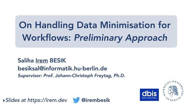 P R I VA C Y P O L I C Y [2] Besik, Saliha Irem, and Johann-Christoph Freytag. "A formal approach to build privacy-awareness into clinical workflows." SICS (2019): 1-12. [3] Shastri, Supreeth, et al. "Understanding and Benchmarking the Impact of GDPR on Database Systems.” appears in VLDB`2020. Privacy Metadata • the modality of data processing, whether it is obligatory or voluntary • how long it is retained S.I. Besik, On Handling Data Minimisation for Workflows, December 12, ’19 / 27 11