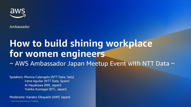 © 2023, Amazon Web Services, Inc. or its affiliates. Ambassador How to build shining workplace for women engineers ~ AWS Ambassador Japan Meetup Event with NTT Data ~ Speakers: Monica Colangelo (NTT Data, Italy) Irene Aguilar (NTT Data, Spain) Ai Hayakawa (NRI, Japan) Yukiko Kumagai (BTC, Japan) Moderator: Kanako Obayashi (AWS Japan)