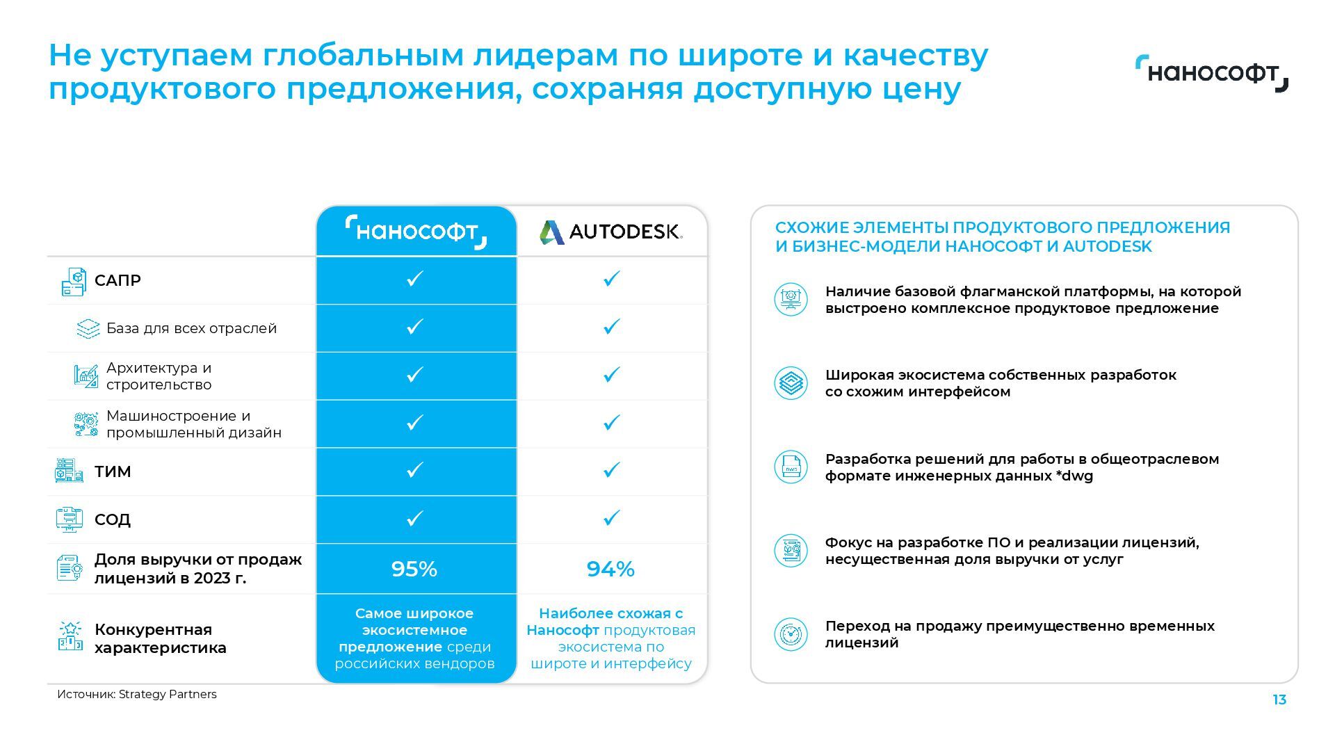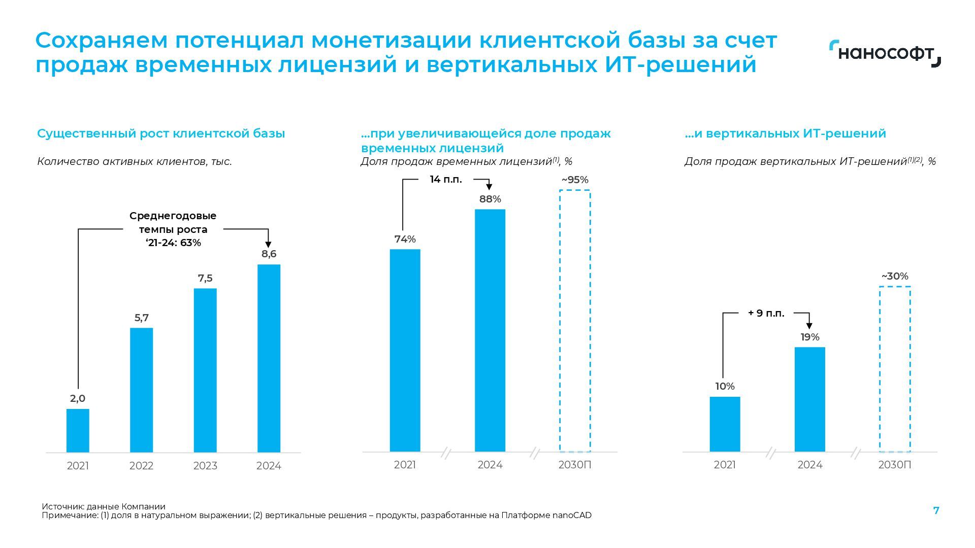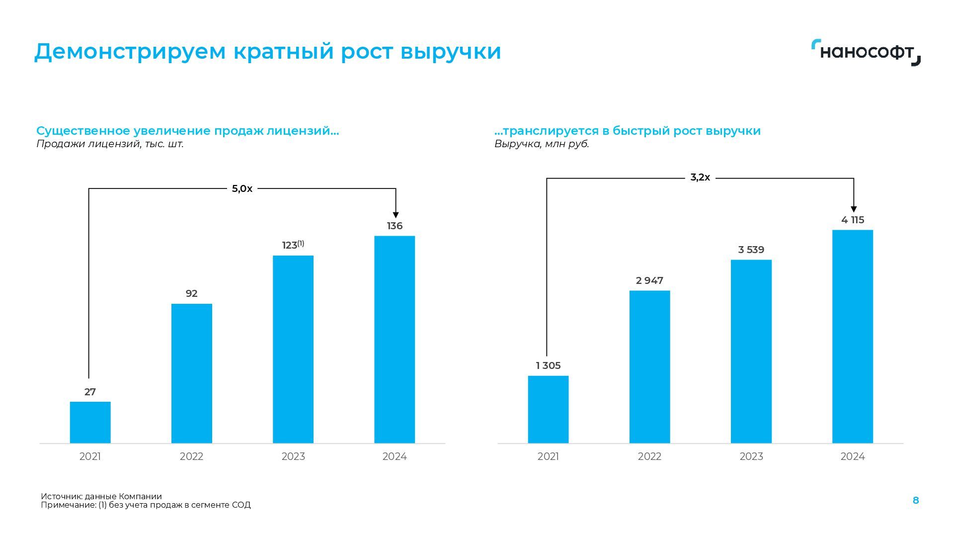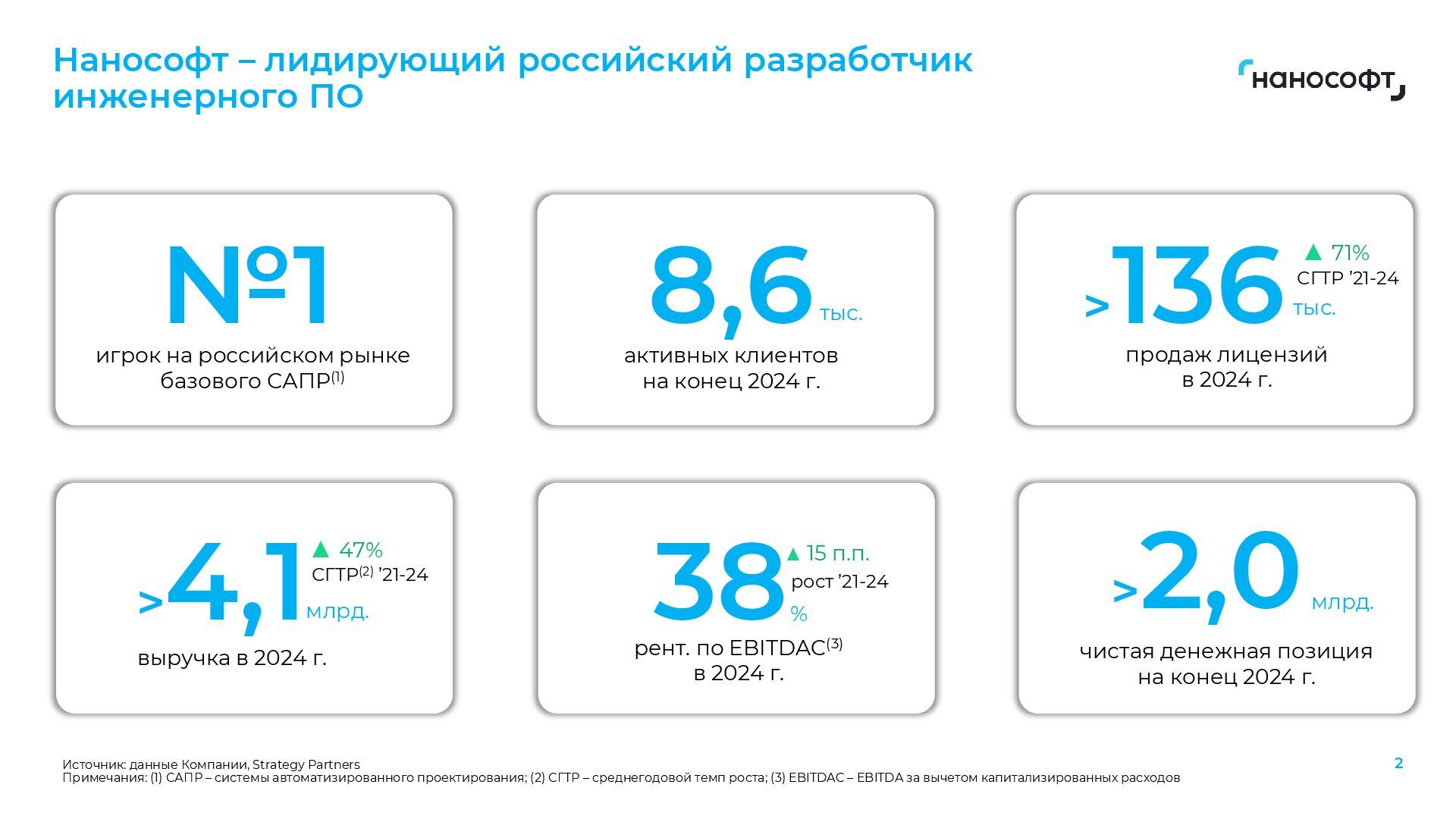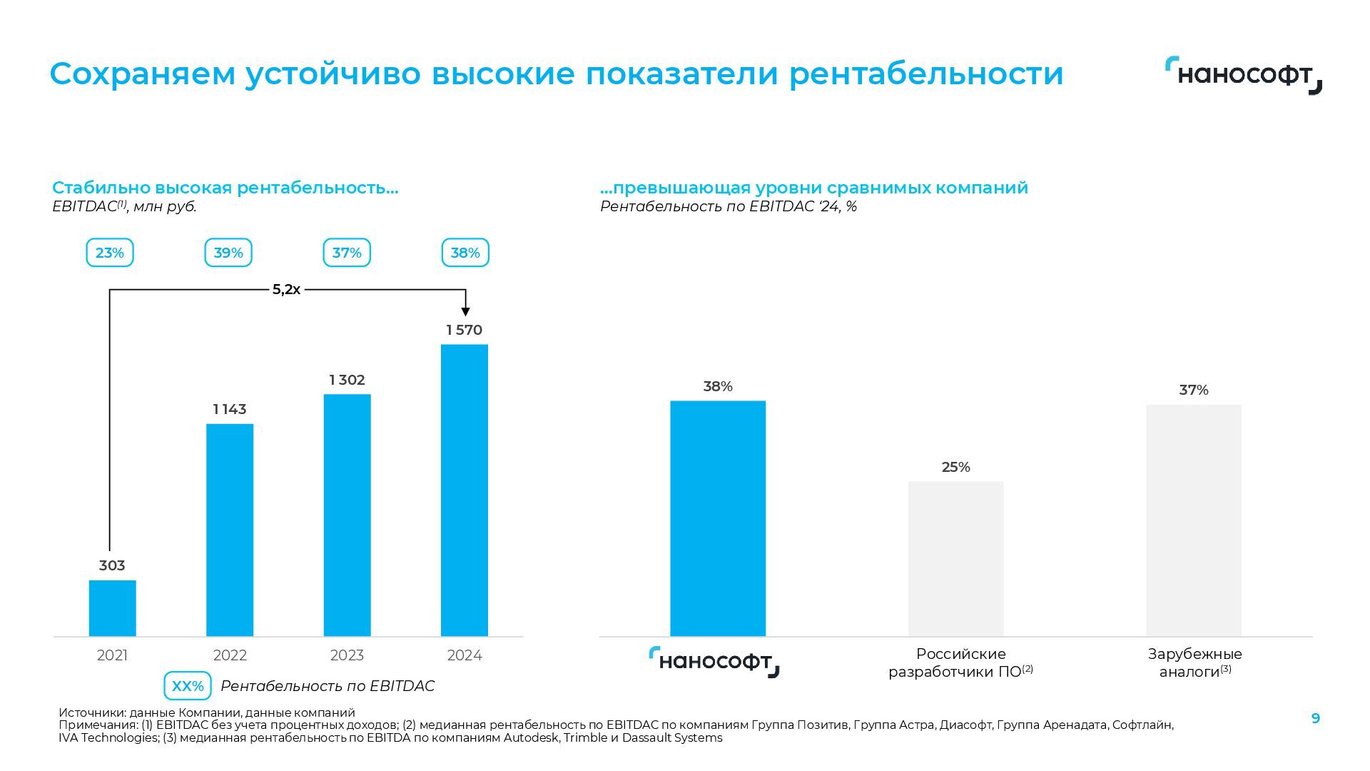 млн руб. …превышающая уровни сравнимых компаний Рентабельность по EBITDAC ‘24, % Источники: данные Компании, данные компаний Примечания: (1) EBITDAC без учета процентных доходов; (2) медианная рентабельность по EBITDAC по компаниям Группа Позитив, Группа Астра, Диасофт, Группа Аренадата, Софтлайн, IVA Technologies; (3) медианная рентабельность по EBITDA по компаниям Autodesk, Trimble и Dassault Systems 38% 25% 37% XX% Рентабельность по EBITDAC Зарубежные аналоги(3) 303 1 143 1 302 1 570 2021 2022 2023 2024 5,2x 23% 37% 38% 39% Российские разработчики ПО(2)