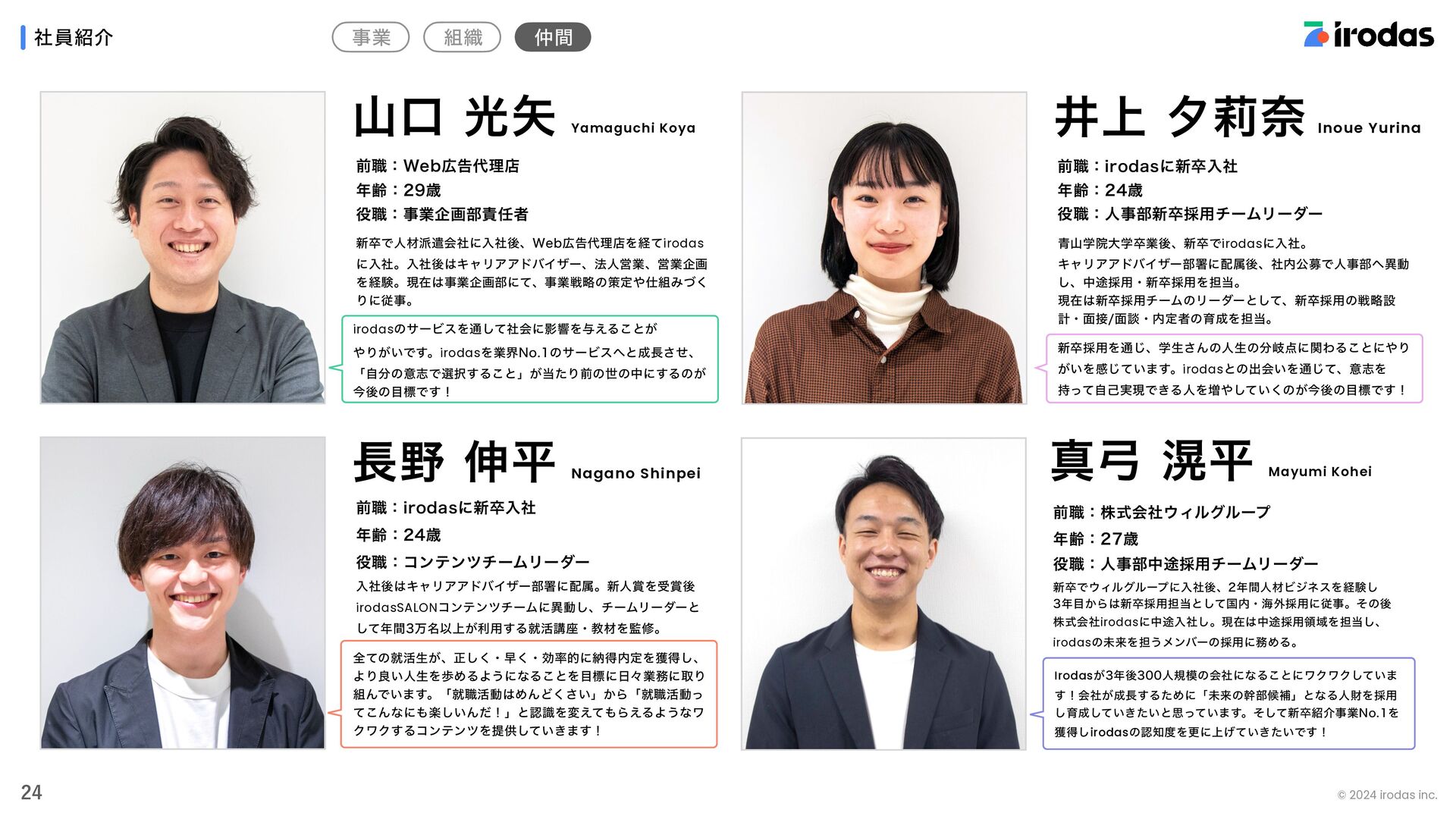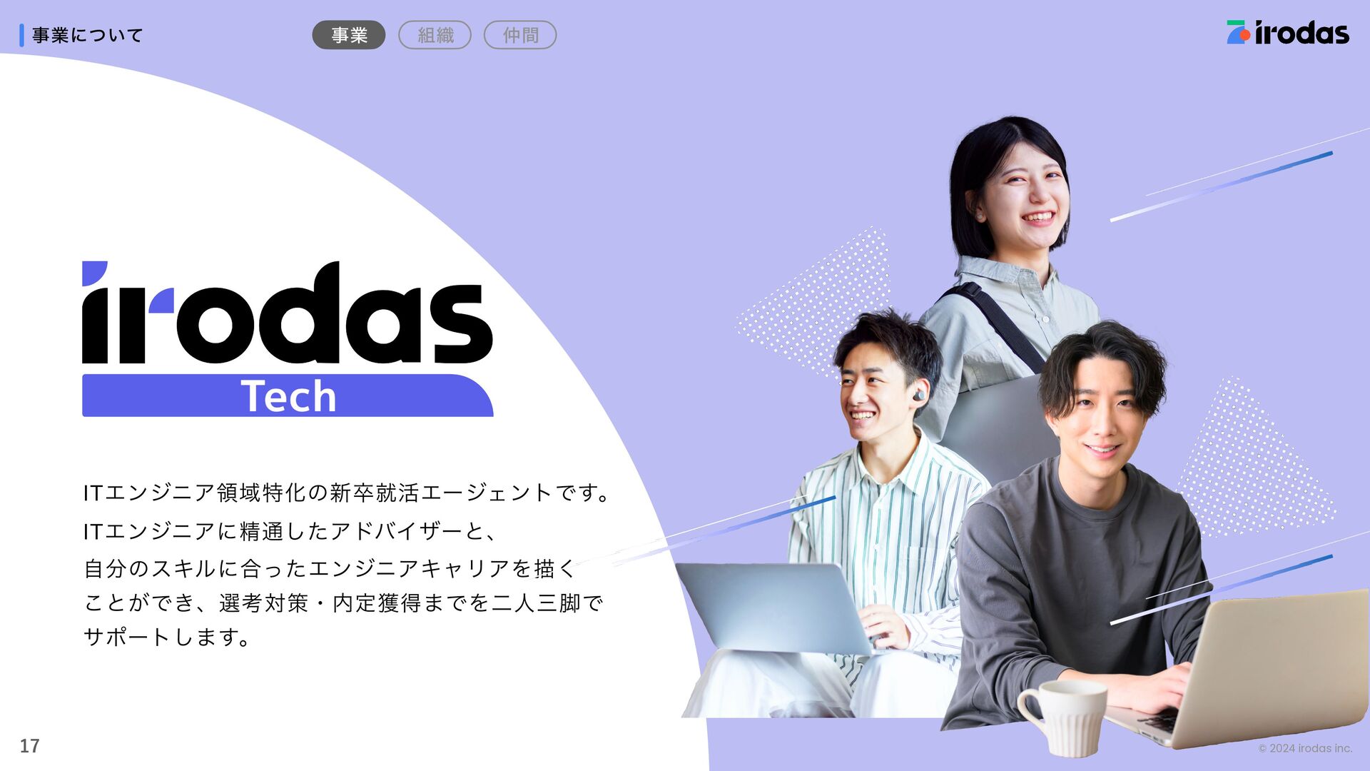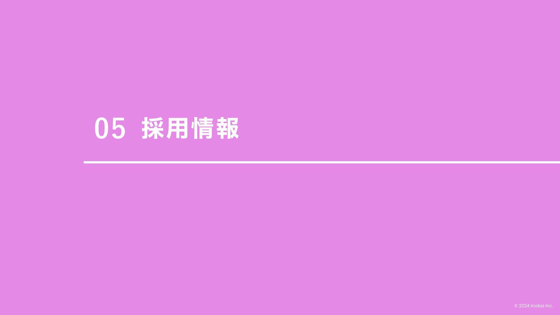 ࣄۀʹ͍ͭͯ ࣄۀ ৫ ؒ © 2024 irodas inc. ৽ଔྖҬਓࡐհαʔϏεʮirodas৽ଔΤʔδΣϯτʯʮirodasTechʯ