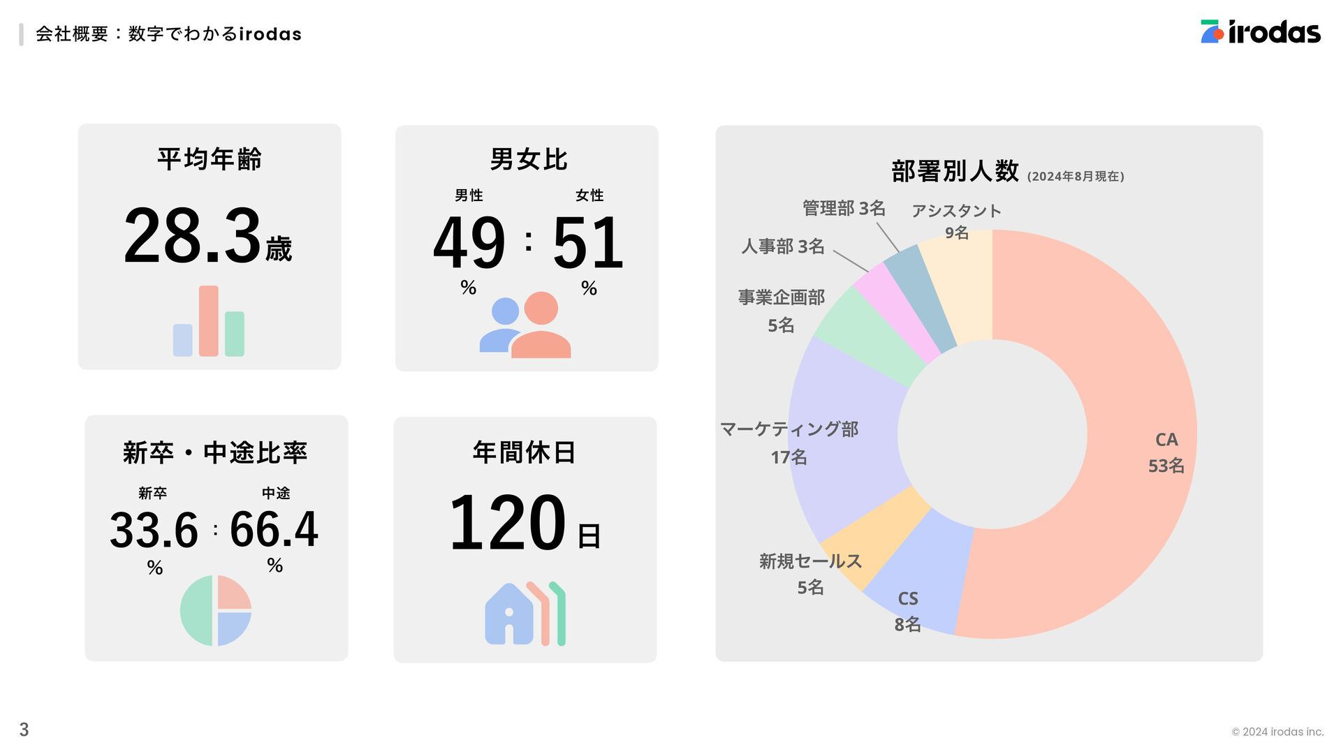 ৽ଔ த్ உੑ ঁੑ (20248݄ݱࡏ) ਓࣄ෦ 3໊ ཧ෦ 3໊ Ξγελϯτ 9໊ ৽نηʔϧε 5໊ © 2024 irodas inc. ࣄۀاը෦ 5໊ ϚʔέςΟϯά෦ 17໊ CA 53໊ CS 8໊