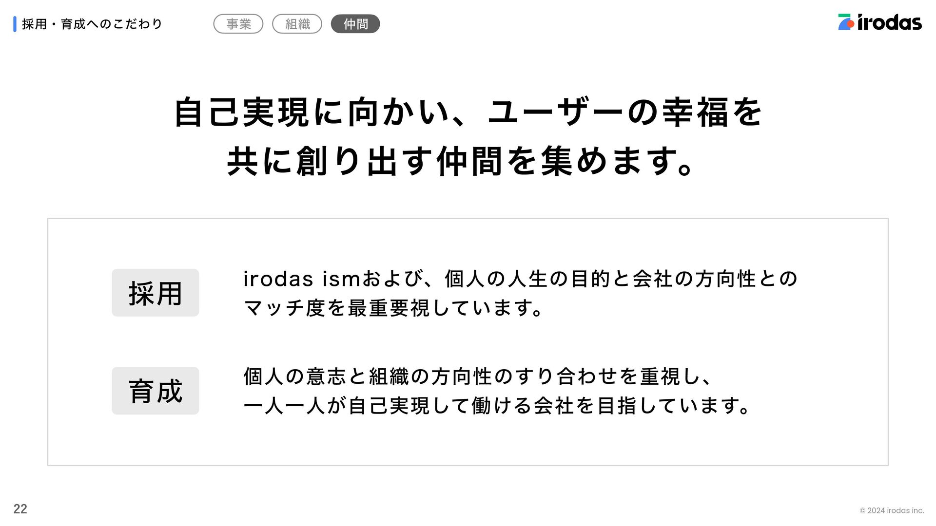 ސ٬ɾࣾһͷਓੜͷతͷ࣮ݱʹ͖߹͏ࣾ෩Ͱ͢ɻ irodas ism ૉɾݠڏɾײँɾ৴པ ɾJTNମݱΛ࠷ॏཁࢹͯ͠࠾༻ɾҭΛߦ͓ͬͯΓɺ ɹඞવతʹʮਓؒྗʯ͕ߴ͍͕ؒू·͍ͬͯ·͢ɻ ɾࣾһجຊతʹࢹ͕ΧελϚʔϑΝʔετͰ͋Γɺ ɹϢʔβʔͷਓੜʹ͓͚Δࣗݾ࣮ݱɺͦͷͨΊͷΩϟϦΞ ɹબʹશྗͰ͖߹͍·͢ɻ ɾࣾһਓਓͷҙࢤً͕͚ΔΑ͏ʹɺձࣾͱࣾһ͕