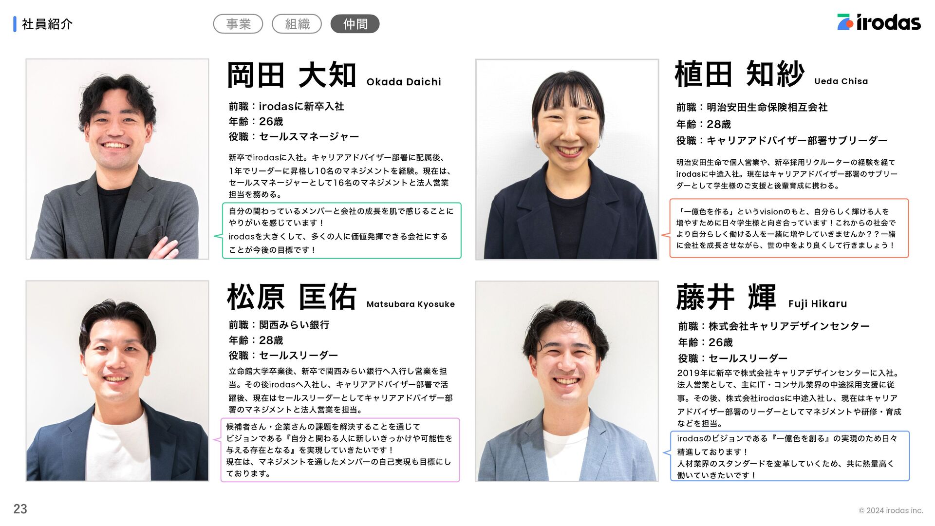 ࣗͷؔΘ͍ͬͯΔϝϯόʔͱձࣾͷΛഽͰײ͡Δ͜ͱʹ Γ͕͍Λײ͍ͯ͡·͢ʂ irodasΛେ͖ͯ͘͠ɺଟ͘ͷਓʹՁൃشͰ͖Δձࣾʹ͢Δ ͜ͱ͕ࠓޙͷඪͰ͢ʂ দݪڡ༎ Matsubara Kyosuke લ৬ɿؔΈΒ͍ۜߦ ྸɿࡀ ໋ཱؗେֶଔۀޙɺ৽ଔͰؔΈΒ͍ۜߦೖߦ͠ӦۀΛ୲ ɻͦͷޙirodasೖࣾ͠ɺΩϟϦΞΞυόΠβʔ෦ॺͰ׆ ༂ޙɺݱࡏηʔϧεϦʔμʔͱͯ͠ΩϟϦΞΞυόΠβʔ෦ ॺͷϚωδϝϯτͱ๏ਓӦۀΛ୲ɻ ީิऀ͞Μɾاۀ͞Μͷ՝Λղܾ͢Δ͜ͱΛ௨ͯ͡ ϏδϣϯͰ͋ΔʰࣗͱؔΘΔਓʹ৽͍͖͔͚ͬ͠ՄೳੑΛ ༩͑ΔଘࡏͱͳΔʱΛ࣮ݱ͍͖͍ͯͨ͠Ͱ͢ʂ ݱࡏɺϚωδϝϯτΛ௨ͨ͠ϝϯόʔͷࣗݾ࣮ݱඪʹ͠ ͓ͯΓ·͢ɻ ౻Ҫً Fuji Hikaru લ৬ɿגࣜձࣾΩϟϦΞσβΠϯηϯλʔ ྸɿࡀ ʹ৽ଔͰגࣜձࣾΩϟϦΞσβΠϯηϯλʔʹೖࣾɻ ๏ਓӦۀͱͯ͠ɺओʹ*5ɾίϯαϧۀքͷத్࠾༻ࢧԉʹै ࣄɻͦͷޙɺגࣜձࣾirodasʹத్ೖࣾ͠ɺݱࡏΩϟϦΞ ΞυόΠβʔ෦ॺͷϦʔμʔͱͯ͠Ϛωδϝϯτݚमɾҭ ͳͲΛ୲ɻ irodasͷϏδϣϯͰ͋ΔʰҰԯ৭ΛΔʱͷ࣮ݱͷͨΊʑ ਫ਼ਐ͓ͯ͠Γ·͢ʂ ਓࡐۀքͷελϯμʔυΛมֵ͍ͯͨ͘͠Ίɺڞʹྔߴ͘ ಇ͍͍͖͍ͯͨͰ͢ʂ ࣄۀ ৫ ؒ ৬ɿηʔϧεϚωʔδϟʔ ৬ɿηʔϧεϦʔμʔ ৬ɿηʔϧεϦʔμʔ © 2024 irodas inc. ২ాࣿ Ueda Chisa લ৬ɿ໌࣏҆ాੜ໋อݥ૬ޓձࣾ ྸɿࡀ ໌࣏҆ాੜ໋ͰݸਓӦۀɺ৽ଔ࠾༻ϦΫϧʔλʔͷܦݧΛܦͯ irodasʹத్ೖࣾɻݱࡏΩϟϦΞΞυόΠβʔ෦ॺͷαϒϦʔ μʔͱֶͯ͠ੜ༷ͷ͝ࢧԉͱޙഐҭʹܞΘΔɻ ʮҰԯ৭Λ࡞Δʯͱ͍͏WJTJPOͷͱɺࣗΒً͚͘͠ΔਓΛ ૿ͨ͢Ίʹʑֶੜ༷ͱ͖߹͍ͬͯ·͢ʂ͜Ε͔ΒͷࣾձͰ ΑΓࣗΒ͘͠ಇ͚ΔਓΛҰॹʹ૿͍͖ͯ͠·ͤΜ͔ʁʁҰॹ ʹձࣾΛͤ͞ͳ͕ΒɺੈͷதΛΑΓྑͯ͘͠ߦ͖·͠ΐ͏ʂ ৬ɿΩϟϦΞΞυόΠβʔ෦ॺαϒϦʔμʔ