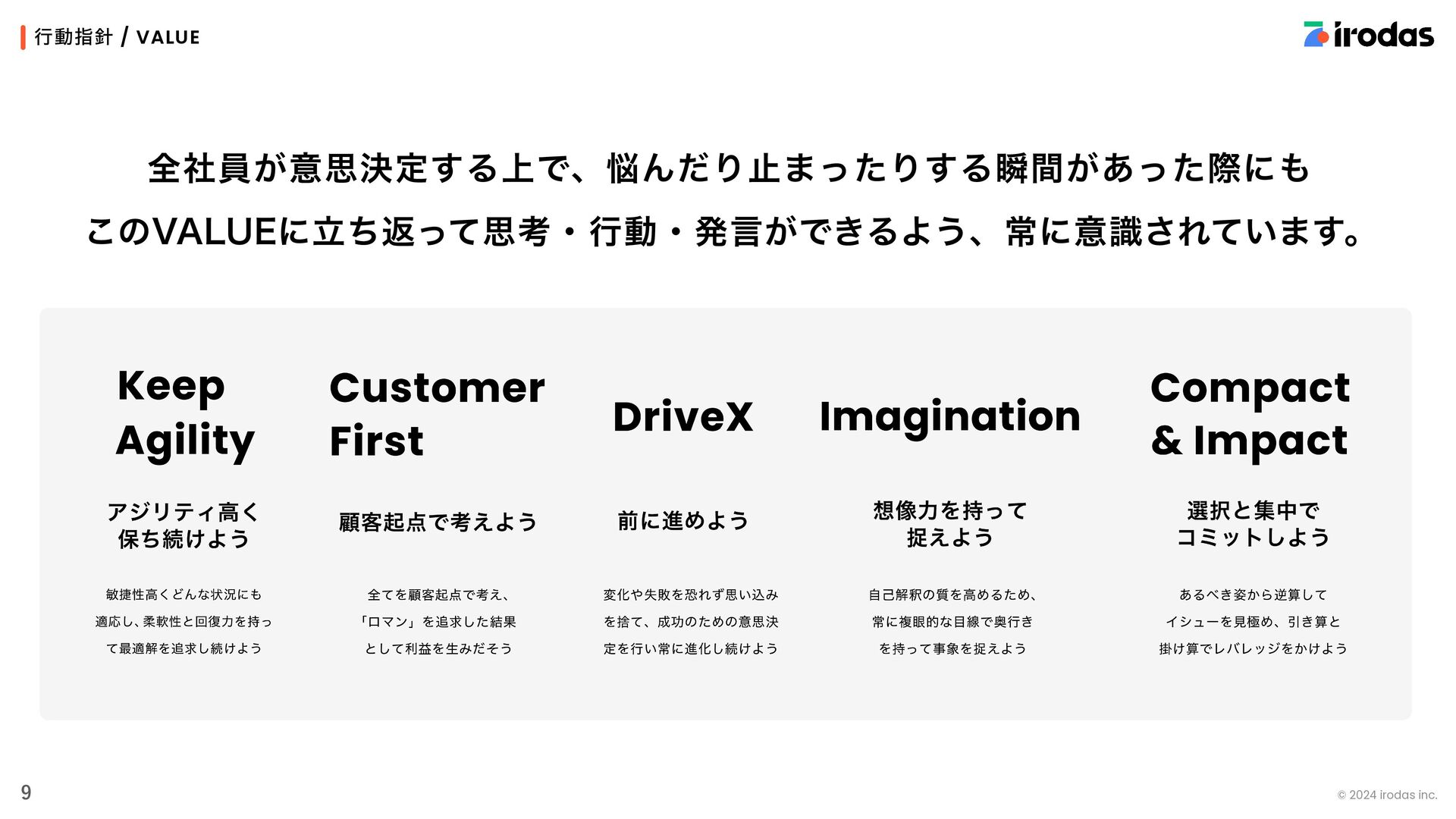 ߦಈࢦ / VALUE શࣾһ͕ҙࢥܾఆ͢Δ্ͰɺΜͩΓࢭ·ͬͨΓ͢Δॠ͕ؒ͋ͬͨࡍʹ ͜ͷ7"-6&ʹཱͪฦͬͯࢥߟɾߦಈɾൃݴ͕Ͱ͖ΔΑ͏ɺৗʹҙࣝ͞Ε͍ͯ·͢ɻ © 2024 irodas inc.